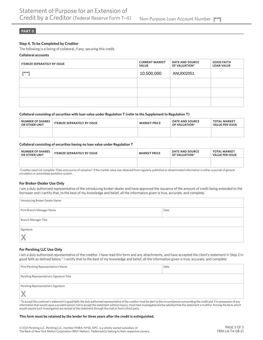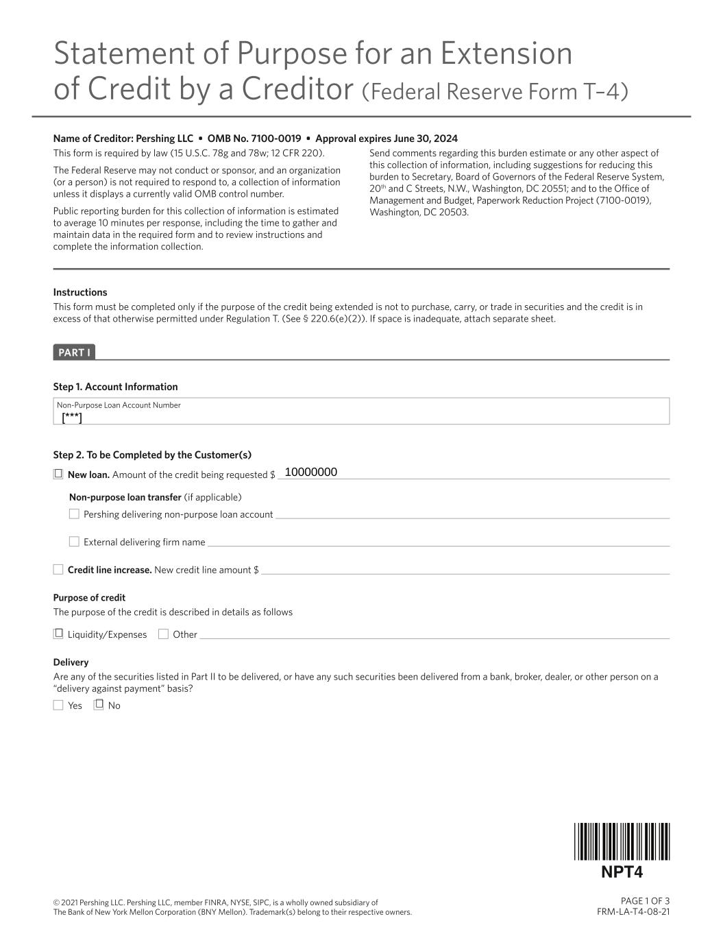 PAGE 1 OF 3 FRM-LA-T4-08-21 © 2021 Pershing LLC. Pershing LLC, member FINRA, NYSE, SIPC, is a wholly owned subsidiary of The Bank of New York Mellon Corporation (BNY Mellon). Trademark(s) belong to their respective owners. Name of Creditor: Pershing LLC • OMB No. 7100-0019 • Approval expires June 30, 2024 This form is required by law (15 U.S.C. 78g and 78w; 12 CFR 220). The Federal Reserve may not conduct or sponsor, and an organization (or a person) is not required to respond to, a collection of information unless it displays a currently valid OMB control number. Public reporting burden for this collection of information is estimated to average 10 minutes per response, including the time to gather and maintain data in the required form and to review instructions and complete the information collection. Send comments regarding this burden estimate or any other aspect of this collection of information, including suggestions for reducing this burden to Secretary, Board of Governors of the Federal Reserve System, 20th and C Streets, N.W., Washington, DC 20551; and to the Office of Management and Budget, Paperwork Reduction Project (7100-0019), Washington, DC 20503. Statement of Purpose for an Extension of Credit by a Creditor (Federal Reserve Form T–4) Instructions This form must be completed only if the purpose of the credit being extended is not to purchase, carry, or trade in securities and the credit is in excess of that otherwise permitted under Regulation T. (See § 220.6(e)(2)). If space is inadequate, attach separate sheet. PART I Step 1. Account Information Non-Purpose Loan Account Number Step 2. To be Completed by the Customer(s) New loan. Amount of the credit being requested $ Non-purpose loan transfer (if applicable) Pershing delivering non-purpose loan account External delivering firm name Credit line increase. New credit line amount $ Purpose of credit The purpose of the credit is described in details as follows Liquidity/Expenses Other Delivery Are any of the securities listed in Part II to be delivered, or have any such securities been delivered from a bank, broker, dealer, or other person on a “delivery against payment” basis? Yes No NPT4 [***] ✔ 10000000 ✔ ✔