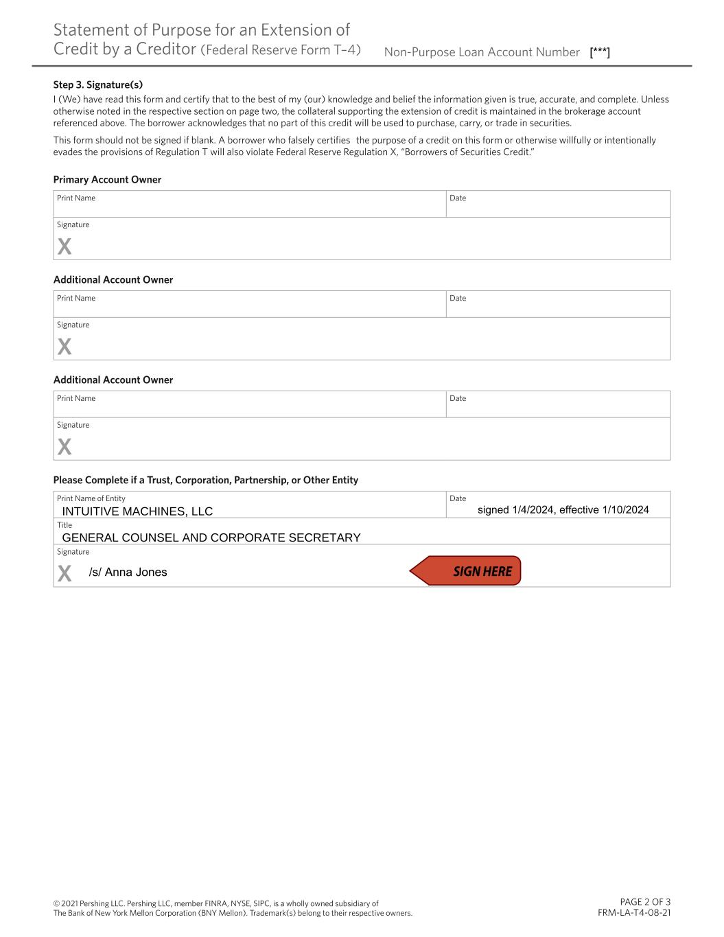 Statement of Purpose for an Extension of Credit by a Creditor (Federal Reserve Form T–4) PAGE 2 OF 3 FRM-LA-T4-08-21 © 2021 Pershing LLC. Pershing LLC, member FINRA, NYSE, SIPC, is a wholly owned subsidiary of The Bank of New York Mellon Corporation (BNY Mellon). Trademark(s) belong to their respective owners. Non-Purpose Loan Account Number Step 3. Signature(s) I (We) have read this form and certify that to the best of my (our) knowledge and belief the information given is true, accurate, and complete. Unless otherwise noted in the respective section on page two, the collateral supporting the extension of credit is maintained in the brokerage account referenced above. The borrower acknowledges that no part of this credit will be used to purchase, carry, or trade in securities. This form should not be signed if blank. A borrower who falsely certifies the purpose of a credit on this form or otherwise willfully or intentionally evades the provisions of Regulation T will also violate Federal Reserve Regulation X, “Borrowers of Securities Credit.” Primary Account Owner Print Name Date Signature X Additional Account Owner Print Name Date Signature X Additional Account Owner Print Name Date Signature X Please Complete if a Trust, Corporation, Partnership, or Other Entity Print Name of Entity Date Title Signature X [***] INTUITIVE MACHINES, LLC GENERAL COUNSEL AND CORPORATE SECRETARY signed 1/4/2024, effective 1/10/2024 /s/ Anna Jones