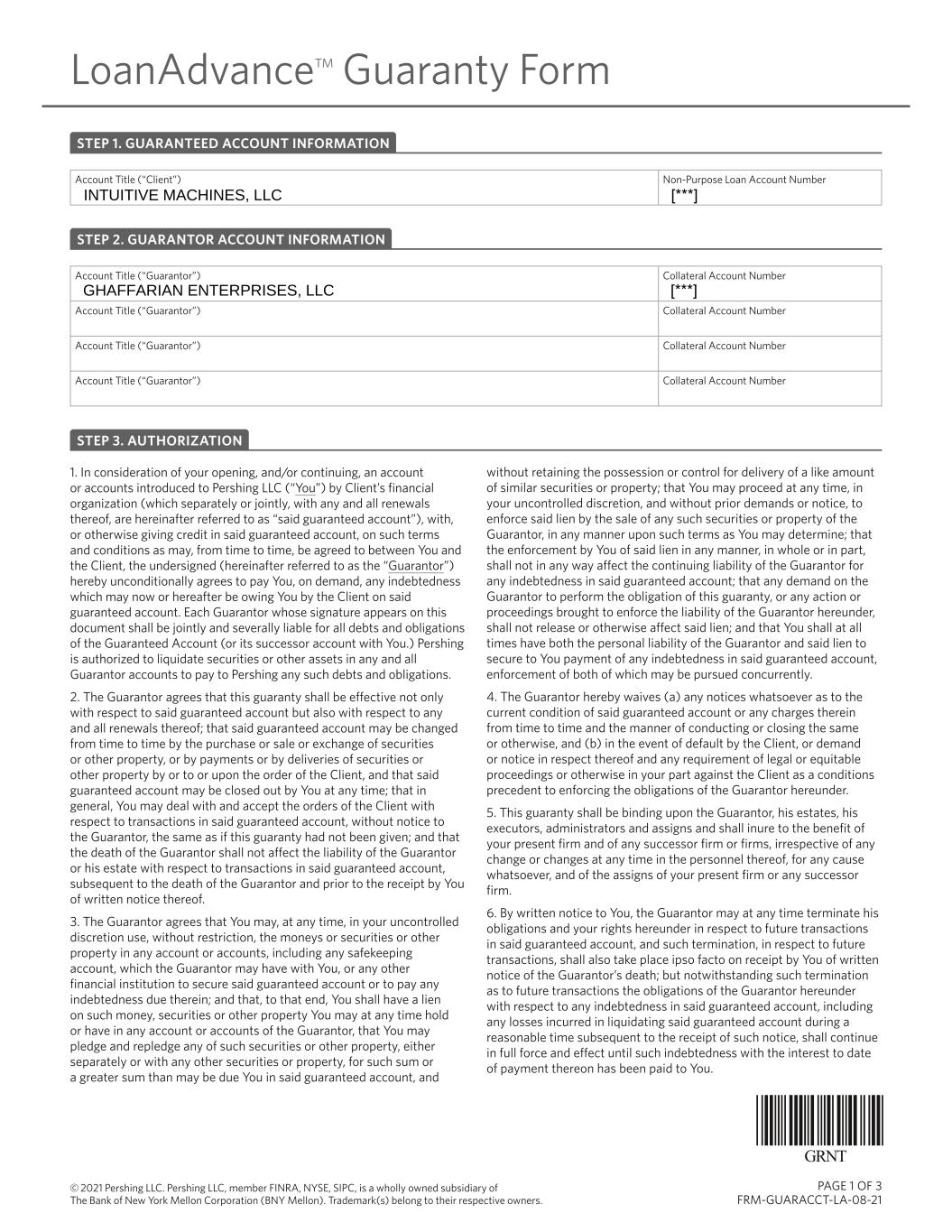 PAGE 1 OF 3 FRM-GUARACCT-LA-08-21 © 2021 Pershing LLC. Pershing LLC, member FINRA, NYSE, SIPC, is a wholly owned subsidiary of The Bank of New York Mellon Corporation (BNY Mellon). Trademark(s) belong to their respective owners. STEP 1. GUARANTEED ACCOUNT INFORMATION Account Title (“Client”) Non-Purpose Loan Account Number STEP 2. GUARANTOR ACCOUNT INFORMATION Account Title (“Guarantor”) Collateral Account Number Account Title (“Guarantor”) Collateral Account Number Account Title (“Guarantor”) Collateral Account Number Account Title (“Guarantor”) Collateral Account Number STEP 3. AUTHORIZATION LoanAdvanceTM Guaranty Form 1. In consideration of your opening, and/or continuing, an account or accounts introduced to Pershing LLC (“You”) by Client’s financial organization (which separately or jointly, with any and all renewals thereof, are hereinafter referred to as “said guaranteed account”), with, or otherwise giving credit in said guaranteed account, on such terms and conditions as may, from time to time, be agreed to between You and the Client, the undersigned (hereinafter referred to as the “Guarantor”) hereby unconditionally agrees to pay You, on demand, any indebtedness which may now or hereafter be owing You by the Client on said guaranteed account. Each Guarantor whose signature appears on this document shall be jointly and severally liable for all debts and obligations of the Guaranteed Account (or its successor account with You.) Pershing is authorized to liquidate securities or other assets in any and all Guarantor accounts to pay to Pershing any such debts and obligations. 2. The Guarantor agrees that this guaranty shall be effective not only with respect to said guaranteed account but also with respect to any and all renewals thereof; that said guaranteed account may be changed from time to time by the purchase or sale or exchange of securities or other property, or by payments or by deliveries of securities or other property by or to or upon the order of the Client, and that said guaranteed account may be closed out by You at any time; that in general, You may deal with and accept the orders of the Client with respect to transactions in said guaranteed account, without notice to the Guarantor, the same as if this guaranty had not been given; and that the death of the Guarantor shall not affect the liability of the Guarantor or his estate with respect to transactions in said guaranteed account, subsequent to the death of the Guarantor and prior to the receipt by You of written notice thereof. 3. The Guarantor agrees that You may, at any time, in your uncontrolled discretion use, without restriction, the moneys or securities or other property in any account or accounts, including any safekeeping account, which the Guarantor may have with You, or any other financial institution to secure said guaranteed account or to pay any indebtedness due therein; and that, to that end, You shall have a lien on such money, securities or other property You may at any time hold or have in any account or accounts of the Guarantor, that You may pledge and repledge any of such securities or other property, either separately or with any other securities or property, for such sum or a greater sum than may be due You in said guaranteed account, and without retaining the possession or control for delivery of a like amount of similar securities or property; that You may proceed at any time, in your uncontrolled discretion, and without prior demands or notice, to enforce said lien by the sale of any such securities or property of the Guarantor, in any manner upon such terms as You may determine; that the enforcement by You of said lien in any manner, in whole or in part, shall not in any way affect the continuing liability of the Guarantor for any indebtedness in said guaranteed account; that any demand on the Guarantor to perform the obligation of this guaranty, or any action or proceedings brought to enforce the liability of the Guarantor hereunder, shall not release or otherwise affect said lien; and that You shall at all times have both the personal liability of the Guarantor and said lien to secure to You payment of any indebtedness in said guaranteed account, enforcement of both of which may be pursued concurrently. 4. The Guarantor hereby waives (a) any notices whatsoever as to the current condition of said guaranteed account or any charges therein from time to time and the manner of conducting or closing the same or otherwise, and (b) in the event of default by the Client, or demand or notice in respect thereof and any requirement of legal or equitable proceedings or otherwise in your part against the Client as a conditions precedent to enforcing the obligations of the Guarantor hereunder. 5. This guaranty shall be binding upon the Guarantor, his estates, his executors, administrators and assigns and shall inure to the benefit of your present firm and of any successor firm or firms, irrespective of any change or changes at any time in the personnel thereof, for any cause whatsoever, and of the assigns of your present firm or any successor firm. 6. By written notice to You, the Guarantor may at any time terminate his obligations and your rights hereunder in respect to future transactions in said guaranteed account, and such termination, in respect to future transactions, shall also take place ipso facto on receipt by You of written notice of the Guarantor’s death; but notwithstanding such termination as to future transactions the obligations of the Guarantor hereunder with respect to any indebtedness in said guaranteed account, including any losses incurred in liquidating said guaranteed account during a reasonable time subsequent to the receipt of such notice, shall continue in full force and effect until such indebtedness with the interest to date of payment thereon has been paid to You. GRNT INTUITIVE MACHINES, LLC [***] GHAFFARIAN ENTERPRISES, LLC [***]