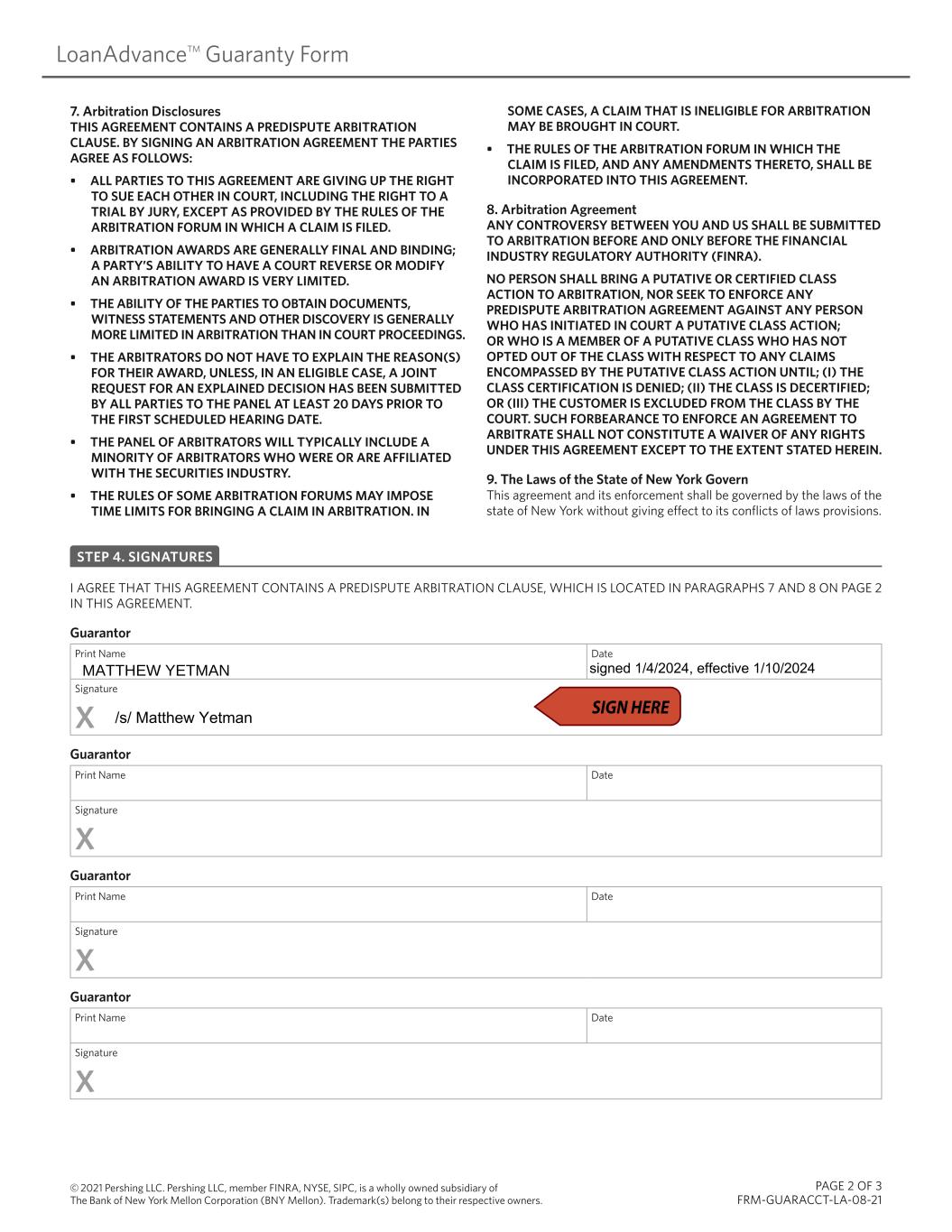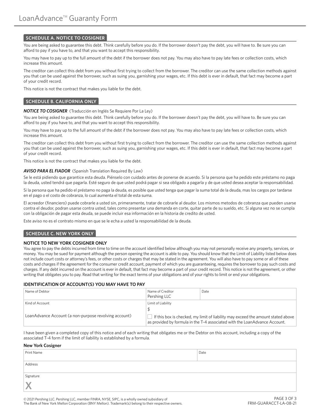 LoanAdvanceTM Guaranty Form PAGE 3 OF 3 FRM-GUARACCT-LA-08-21 © 2021 Pershing LLC. Pershing LLC, member FINRA, NYSE, SIPC, is a wholly owned subsidiary of The Bank of New York Mellon Corporation (BNY Mellon). Trademark(s) belong to their respective owners. SCHEDULE A. NOTICE TO COSIGNER You are being asked to guarantee this debt. Think carefully before you do. If the borrower doesn’t pay the debt, you will have to. Be sure you can afford to pay if you have to, and that you want to accept this responsibility. You may have to pay up to the full amount of the debt if the borrower does not pay. You may also have to pay late fees or collection costs, which increase this amount. The creditor can collect this debt from you without first trying to collect from the borrower. The creditor can use the same collection methods against you that can be used against the borrower, such as suing you, garnishing your wages, etc. If this debt is ever in default, that fact may become a part of your credit record. This notice is not the contract that makes you liable for the debt. SCHEDULE B. CALIFORNIA ONLY NOTICE TO COSIGNER (Traducción en Inglés Se Requiere Por La Ley) You are being asked to guarantee this debt. Think carefully before you do. If the borrower doesn’t pay the debt, you will have to. Be sure you can afford to pay if you have to, and that you want to accept this responsibility. You may have to pay up to the full amount of the debt if the borrower does not pay. You may also have to pay late fees or collection costs, which increase this amount. The creditor can collect this debt from you without first trying to collect from the borrower. The creditor can use the same collection methods against you that can be used against the borrower, such as suing you, garnishing your wages, etc. If this debt is ever in default, that fact may become a part of your credit record. This notice is not the contract that makes you liable for the debt. AVISO PARA EL FIADOR (Spanish Translation Required By Law) Se le está pidiendo que garantice esta deuda. Piénselo con cuidado antes de ponerse de acuerdo. Si la persona que ha pedido este préstamo no paga la deuda, usted tendrá que pagarla. Esté seguro de que usted podrá pagar si sea obligado a pagarla y de que usted desea aceptar la responsabilidad. Si la persona que ha pedido el préstamo no paga la deuda, es posible que usted tenga que pagar la suma total de la deuda, mas los cargos por tardarse en el pago o el costo de cobranza, lo cual aumenta el total de esta suma. El acreedor (financiero) puede cobrarle a usted sin, primeramente, tratar de cobrarle al deudor. Los mismos metodos de cobranza que pueden usarse contra el deudor, podran usarse contra usted, tales como presentar una demanda en corte, quitar parte de su sueldo, etc. Si alguna vez no se cumpla con la obligación de pagar esta deuda, se puede incluir esa información en la historia de credito de usted. Este aviso no es el contrato mismo en que se le echa a usted la responsabilidad de la deuda. SCHEDULE C. NEW YORK ONLY NOTICE TO NEW YORK COSIGNER ONLY You agree to pay the debts incurred from time to time on the account identified below although you may not personally receive any property, services, or money. You may be sued for payment although the person opening the account is able to pay. You should know that the Limit of Liability listed below does not include court costs or attorney’s fees, or other costs or charges that may be stated in the agreement. You will also have to pay some or all of these costs and charges if the agreement for the consumer credit account, payment of which you are guaranteeing, requires the borrower to pay such costs and charges. If any debt incurred on the account is ever in default, that fact may become a part of your credit record. This notice is not the agreement, or other writing that obligates you to pay. Read that writing for the exact terms of your obligations and of your rights to limit or end your obligations. IDENTIFICATION OF ACCOUNT(S) YOU MAY HAVE TO PAY Name of Debtor Name of Creditor Pershing LLC Date Kind of Account LoanAdvance Account (a non-purpose revolving account) Limit of Liability $ If this box is checked, my limit of liability may exceed the amount stated above as provided by formula in the T-4 associated with the LoanAdvance Account. I have been given a completed copy of this notice and of each writing that obligates me or the Debtor on this account, including a copy of the associated T-4 form if the limit of liability is established by a formula. New York Cosigner Print Name Date Address Signature X