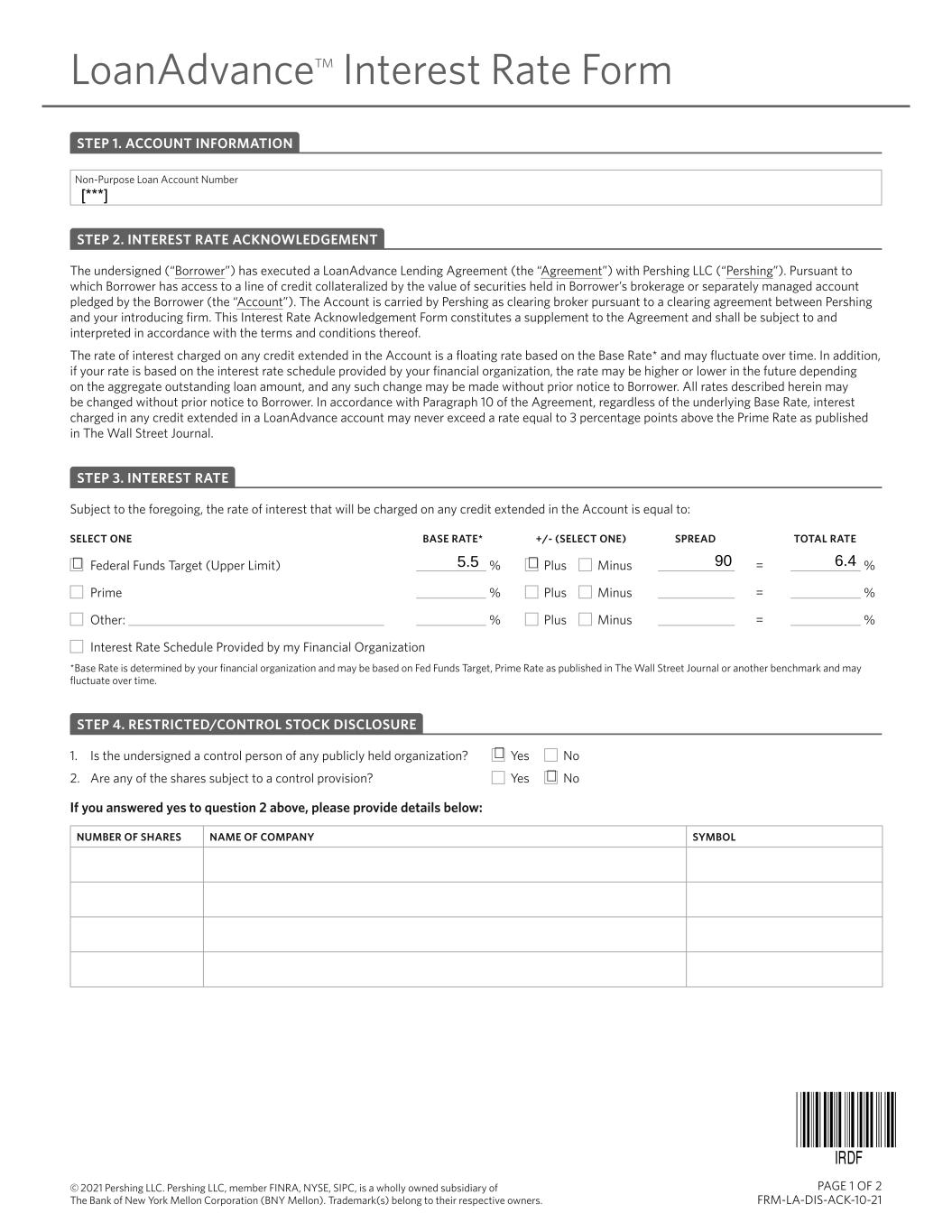 PAGE 1 OF 2 FRM-LA-DIS-ACK-10-21 © 2021 Pershing LLC. Pershing LLC, member FINRA, NYSE, SIPC, is a wholly owned subsidiary of The Bank of New York Mellon Corporation (BNY Mellon). Trademark(s) belong to their respective owners. STEP 1. ACCOUNT INFORMATION Non-Purpose Loan Account Number STEP 2. INTEREST RATE ACKNOWLEDGEMENT The undersigned (“Borrower”) has executed a LoanAdvance Lending Agreement (the “Agreement”) with Pershing LLC (“Pershing”). Pursuant to which Borrower has access to a line of credit collateralized by the value of securities held in Borrower’s brokerage or separately managed account pledged by the Borrower (the “Account”). The Account is carried by Pershing as clearing broker pursuant to a clearing agreement between Pershing and your introducing firm. This Interest Rate Acknowledgement Form constitutes a supplement to the Agreement and shall be subject to and interpreted in accordance with the terms and conditions thereof. The rate of interest charged on any credit extended in the Account is a floating rate based on the Base Rate* and may fluctuate over time. In addition, if your rate is based on the interest rate schedule provided by your financial organization, the rate may be higher or lower in the future depending on the aggregate outstanding loan amount, and any such change may be made without prior notice to Borrower. All rates described herein may be changed without prior notice to Borrower. In accordance with Paragraph 10 of the Agreement, regardless of the underlying Base Rate, interest charged in any credit extended in a LoanAdvance account may never exceed a rate equal to 3 percentage points above the Prime Rate as published in The Wall Street Journal. STEP 3. INTEREST RATE Subject to the foregoing, the rate of interest that will be charged on any credit extended in the Account is equal to: SELECT ONE BASE RATE* +/- (SELECT ONE) SPREAD TOTAL RATE Federal Funds Target (Upper Limit) % Plus Minus = % Prime % Plus Minus = % Other: % Plus Minus = % Interest Rate Schedule Provided by my Financial Organization *Base Rate is determined by your financial organization and may be based on Fed Funds Target, Prime Rate as published in The Wall Street Journal or another benchmark and may fluctuate over time. STEP 4. RESTRICTED/CONTROL STOCK DISCLOSURE 1. Is the undersigned a control person of any publicly held organization? Yes No 2. Are any of the shares subject to a control provision? Yes No If you answered yes to question 2 above, please provide details below: NUMBER OF SHARES NAME OF COMPANY SYMBOL LoanAdvanceTM Interest Rate Form IRDF [***] ✔ 5.5 ✔ 90 6.4 ✔ ✔