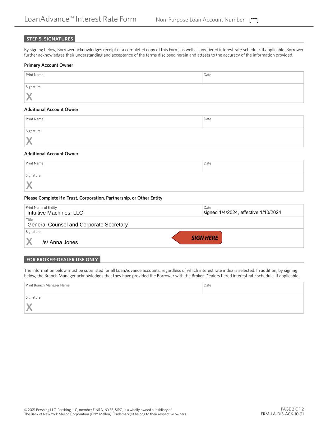 Non-Purpose Loan Account NumberLoanAdvanceTM Interest Rate Form PAGE 2 OF 2 FRM-LA-DIS-ACK-10-21 © 2021 Pershing LLC. Pershing LLC, member FINRA, NYSE, SIPC, is a wholly owned subsidiary of The Bank of New York Mellon Corporation (BNY Mellon). Trademark(s) belong to their respective owners. STEP 5. SIGNATURES By signing below, Borrower acknowledges receipt of a completed copy of this Form, as well as any tiered interest rate schedule, if applicable. Borrower further acknowledges their understanding and acceptance of the terms disclosed herein and attests to the accuracy of the information provided. Primary Account Owner Print Name Date Signature X Additional Account Owner Print Name Date Signature X Additional Account Owner Print Name Date Signature X Please Complete if a Trust, Corporation, Partnership, or Other Entity Print Name of Entity Title Signature X FOR BROKER-DEALER USE ONLY The information below must be submitted for all LoanAdvance accounts, regardless of which interest rate index is selected. In addition, by signing below, the Branch Manager acknowledges that they have provided the Borrower with the Broker-Dealers tiered interest rate schedule, if applicable. Print Branch Manager Name Date Signature X [***] Intuitive Machines, LLC General Counsel and Corporate Secretary Date signed 1/4/2024, effective 1/10/2024 /s/ Anna Jones