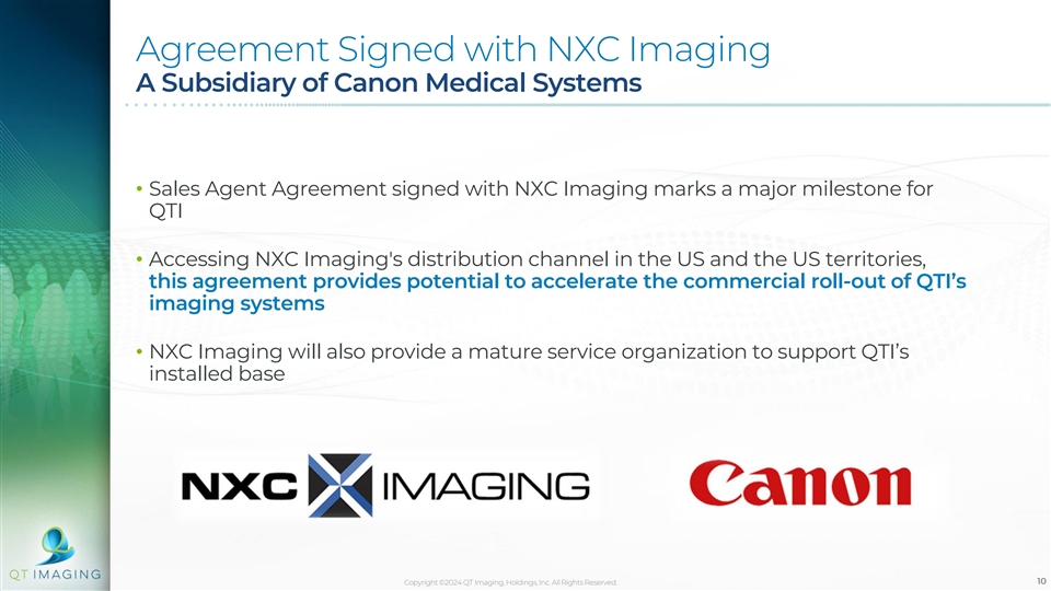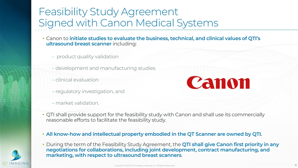 Agreement Signed with NXC Imaging A Subsidiary of Canon Medical Systems • Sales Agent Agreement signed with NXC Imaging marks a major milestone for QTI • Accessing NXC Imaging's distribution channel in the US and the US territories, this agreement provides potential to accelerate the commercial roll-out of QTI’s imaging systems • NXC Imaging will also provide a mature service organization to support QTI’s installed base Copyright ©2024 QT Imaging, Holdings, Inc. All Rights Reserved. 10
