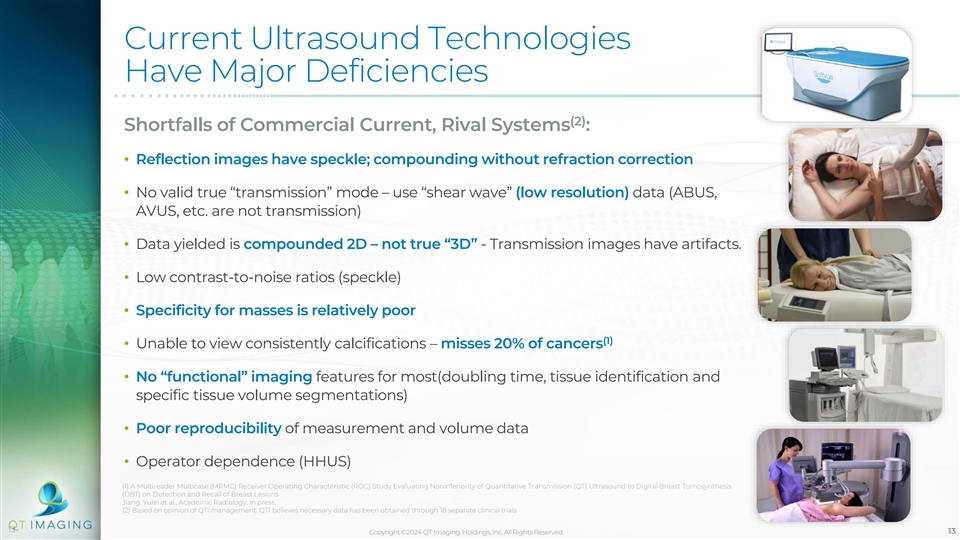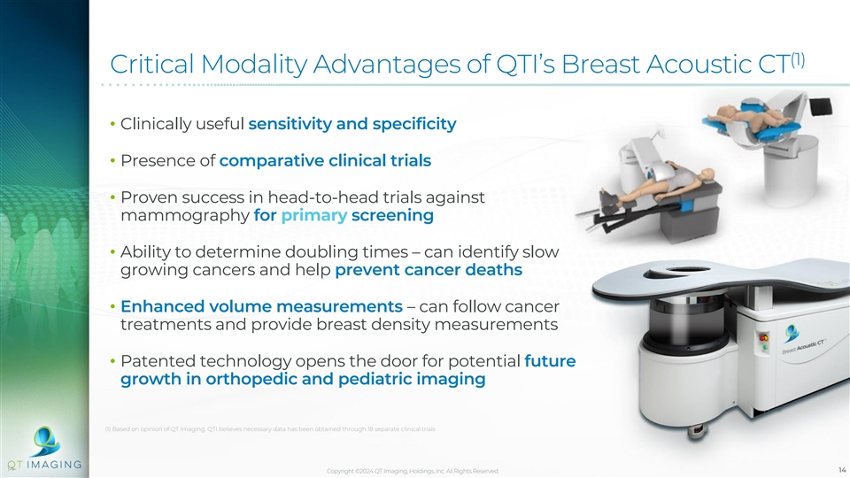 Current Ultrasound Technologies Have Major Deficiencies (2) Shortfalls of Commercial Current, Rival Systems : • Reflection images have speckle; compounding without refraction correction • No valid true “transmission” mode – use “shear wave” (low resolution) data (ABUS, AVUS, etc. are not transmission) • Data yielded is compounded 2D – not true “3D” - Transmission images have artifacts. • Low contrast-to-noise ratios (speckle) • Specificity for masses is relatively poor (1) • Unable to view consistently calcifications – misses 20% of cancers • No “functional” imaging features for most(doubling time, tissue identification and specific tissue volume segmentations) • Poor reproducibility of measurement and volume data • Operator dependence (HHUS) (1) A Multireader Multicase (MRMC) Receiver Operating Characteristic (ROC) Study Evaluating Noninferiority of Quantitative Transmission (QT) Ultrasound to Digital Breast Tomosynthesis (DBT) on Detection and Recall of Breast Lesions Jiang, Yulei et al., Academic Radiology, in press. (2) Based on opinion of QTI management. QTI believes necessary data has been obtained through 18 separate clinical trials 13 Copyright ©2024 QT Imaging, Holdings, Inc. All Rights Reserved. 13
