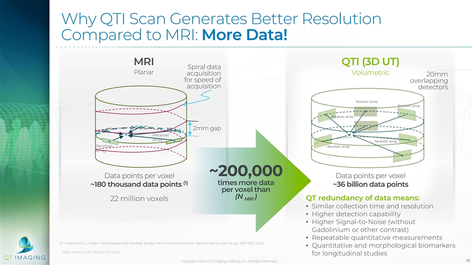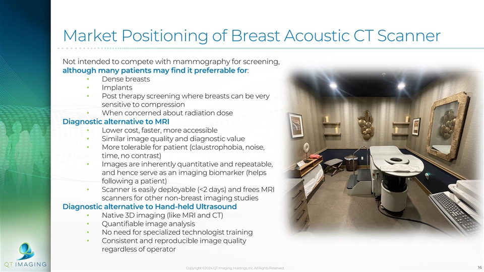 Why QTI Scan Generates Better Resolution Compared to MRI: More Data! MRI QTI (3D UT) Spiral data Planar Volumetric acquisition 20mm for speed of overlapping acquisition detectors 2mm gap Receiver Array Receiver Array ~200,000 Data points per voxel Data points per voxel (1) times more data ~180 thousand data points ~36 billion data points per voxel than (N ) QT redundancy of data means: 22 million voxels MRI • Similar collection time and resolution • Higher detection capability • Higher Signal-to-Noise (without Gadolinium or other contrast) • Repeatable quantitative measurements (1) Y. Gao and S. L. Heller, Abbreviated and Ultrafast Breast MRI in Clinical Practice, RadioGraphics, vol. 40, pp. 1507-1527, 2020 • Quantitative and morphological biomarkers Note: Voxel is a 3D version of a pixel for longitudinal studies Copyright ©2024 QT Imaging, Holdings, Inc. All Rights Reserved. 15