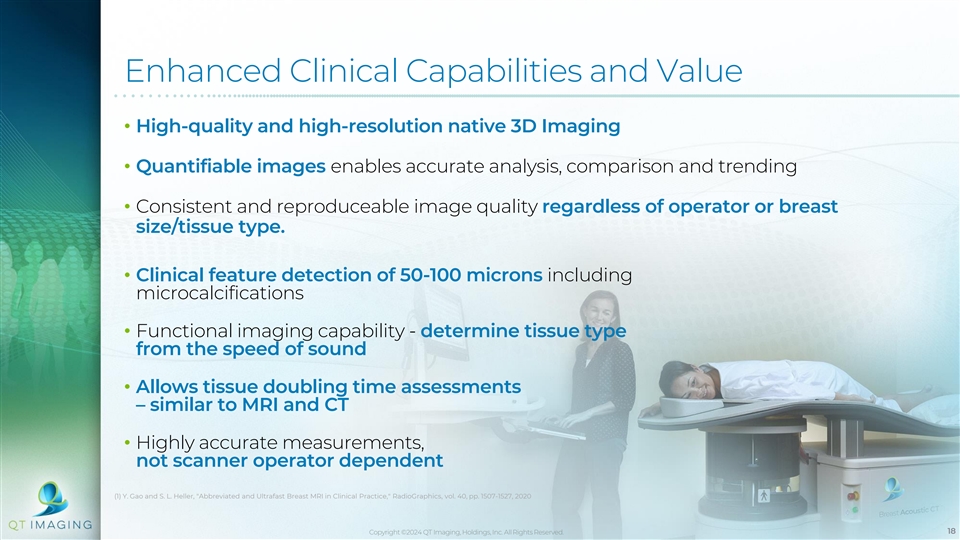 Technical Capabilities (1) • Resolution of ~600 microns in reflection compared to 800 microns for MRI (depends on field strength, homogeneity etc) • Contrast to noise ratio of 23:1 at 100 microns ( in reflection; can detect small calcifications) • Contrast to noise ratio of 15:1 (at resolution in transmission – speed of sound) 0 • Speckle-free because of 360 compounding and refraction correction for reflection image • Volumetric data acquisition (3D), not stacked 2D slices • Volumetric reproducibility 0.2% for fibro glandular volume • Volumetric accuracy better than 3% extrapolated from linear accuracy ~1% ( vertical < 2%) (1) Y. Gao and S. L. Heller, Abbreviated and Ultrafast Breast MRI in Clinical Practice, RadioGraphics, vol. 40, pp. 1507-1527, 2020 Copyright ©2024 QT Imaging, Holdings, Inc. All Rights Reserved. 17