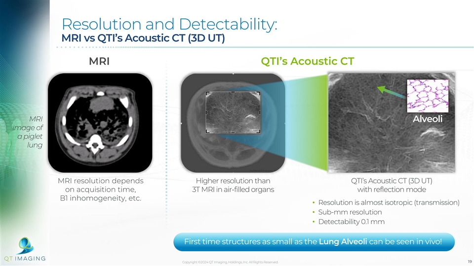 Resolution and Detectability: MRI vs QTI’s Acoustic CT (3D UT) MRI QTI’s Acoustic CT MRI Alveoli image of a piglet lung MRI resolution depends Higher resolution than QTI’s Acoustic CT (3D UT) on acquisition time, 3T MRI in air-filled organs with reflection mode B1 inhomogeneity, etc. • Resolution is almost isotropic (transmission) • Sub-mm resolution • Detectability 0.1 mm First time structures as small as the Lung Alveoli can be seen in vivo! Copyright ©2024 QT Imaging, Holdings, Inc. All Rights Reserved. 19