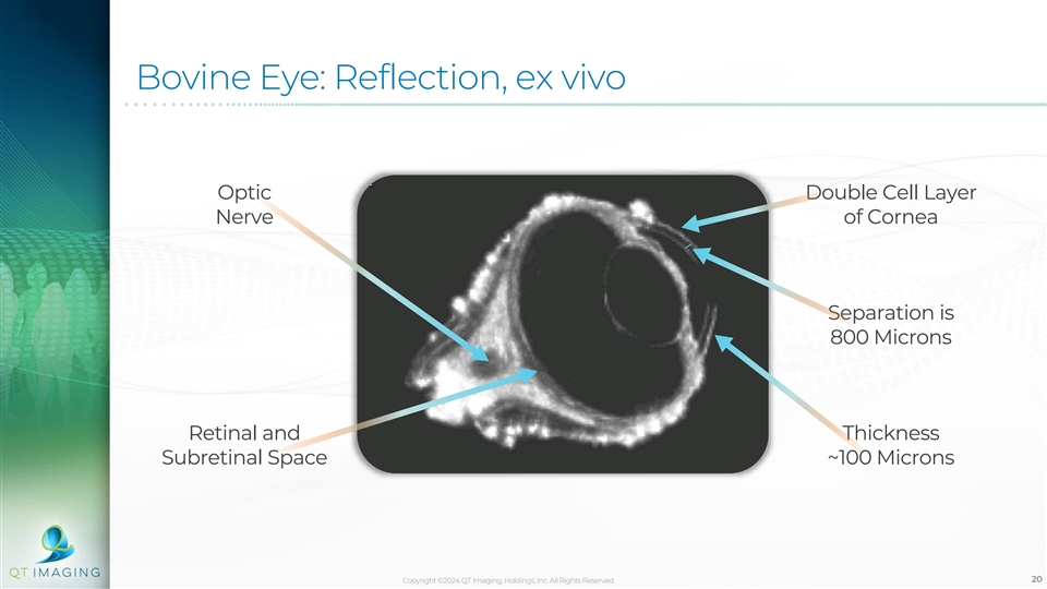 Bovine Eye: Reflection, ex vivo Optic Double Cell Layer Nerve of Cornea Separation is 800 Microns Retinal and Thickness Subretinal Space ~100 Microns Copyright ©2024 QT Imaging, Holdings, Inc. All Rights Reserved. 20