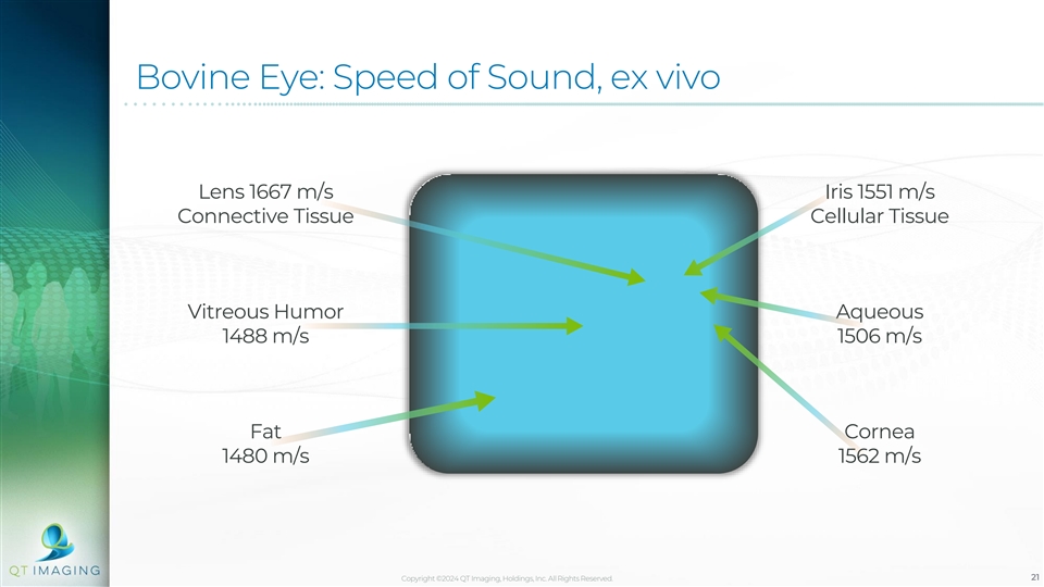 Bovine Eye: Speed of Sound, ex vivo Lens 1667 m/s Iris 1551 m/s Connective Tissue Cellular Tissue Vitreous Humor Aqueous 1488 m/s 1506 m/s Fat Cornea 1480 m/s 1562 m/s Copyright ©2024 QT Imaging, Holdings, Inc. All Rights Reserved. 21
