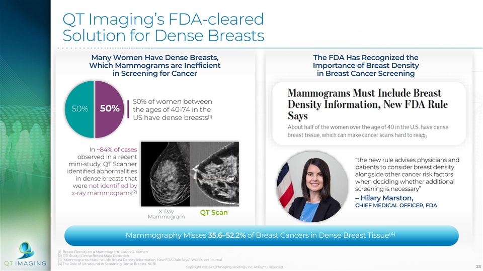 QT Imaging’s FDA-cleared Solution for Dense Breasts Many Women Have Dense Breasts, The FDA Has Recognized the Which Mammograms are Inefficient Importance of Breast Density in Screening for Cancer in Breast Cancer Screening 50% of women between 50% 50% the ages of 40-74 in the (1) US have dense breasts (3) In ~84% of cases observed in a recent “the new rule advises physicians and mini-study, QT Scanner patients to consider breast density identified abnormalities alongside other cancer risk factors in dense breasts that when deciding whether additional were not identified by screening is necessary” (2) x-ray mammograms – Hilary Marston, CHIEF MEDICAL OFFICER, FDA X-Ray QT Scan Mammogram (4) Mammography Misses 35.6–52.2% of Breast Cancers in Dense Breast Tissue (1) Breast Density on a Mammogram, Susan G. Komen (2) QTI Study | Dense Breast Mass Detection (3) “Mammograms Must Include Breast Density Information, New FDA Rule Says”. Wall Street Journal (4) The Role of Ultrasound in Screening Dense Breasts. NCBI. Copyright ©2024 QT Imaging, Holdings, Inc. All Rights Reserved. 23