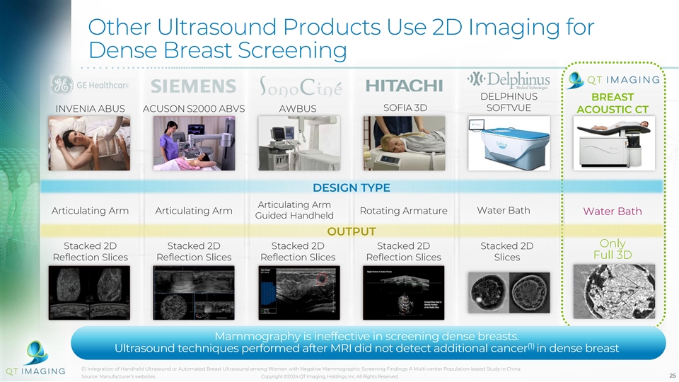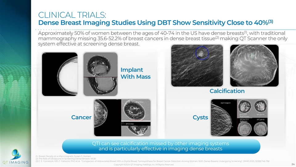 CLINICAL TRIALS: (3) Dense Breast Imaging Studies Using DBT Show Sensitivity Close to 40% (1) Approximately 50% of women between the ages of 40-74 in the US have dense breasts , with traditional (2) mammography missing 35.6-52.2% of breast cancers in dense breast tissue making QT Scanner the only system effective at screening dense breast. Implant With Mass Calcification Cancer Cysts QTI can see calcification missed by other imaging systems and is particularly effective in imaging dense breasts (1) Breast Density on a Mammogram, Susan G. Komen (2) The Role of Ultrasound in Screening Dense Breasts. NCBI. (3) C. E. Comstock, MD, C. Gatsonis, PhD et al. “Comparison of Abbreviated Breast MRI vs Digital Breast Tomosynthesis for Breast Cancer Detection Among Women With Dense Breasts Undergoing Screening”, JAMA 2020, 323(8):746-756 Copyright ©2024 QT Imaging, Holdings, Inc. All Rights Reserved. 24