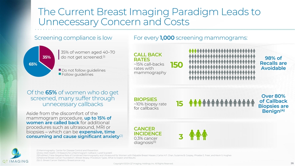 Other Ultrasound Products Use 2D Imaging for Dense Breast Screening DELPHINUS BREAST SOFIA 3D SOFTVUE INVENIA ABUS ACUSON S2000 ABVS AWBUS ACOUSTIC CT DESIGN TYPE Articulating Arm Articulating Arm Articulating Arm Rotating Armature Water Bath Water Bath Guided Handheld OUTPUT Only Stacked 2D Stacked 2D Stacked 2D Stacked 2D Stacked 2D Full 3D Reflection Slices Reflection Slices Reflection Slices Reflection Slices Slices Mammography is ineffective in screening dense breasts. (1) Ultrasound techniques performed after MRI did not detect additional cancer in dense breast (1) Integration of Handheld Ultrasound or Automated Breast Ultrasound among Women with Negative Mammographic Screening Findings: A Multi-center Population-based Study in China Source: Manufacturer’s websites Copyright ©2024 QT Imaging, Holdings, Inc. All Rights Reserved. 25