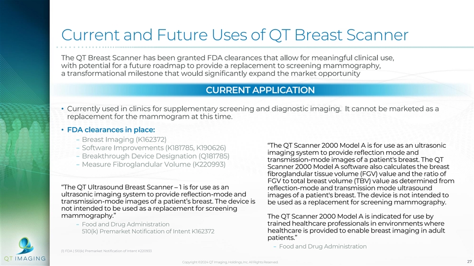 Current and Future Uses of QT Breast Scanner The QT Breast Scanner has been granted FDA clearances that allow for meaningful clinical use, with potential for a future roadmap to provide a replacement to screening mammography, a transformational milestone that would significantly expand the market opportunity CURRENT APPLICATION • Currently used in clinics for supplementary screening and diagnostic imaging. It cannot be marketed as a replacement for the mammogram at this time. • FDA clearances in place: − Breast Imaging (K162372) “The QT Scanner 2000 Model A is for use as an ultrasonic − Software Improvements (K181785, K190626) imaging system to provide reflection mode and − Breakthrough Device Designation (Q181785) transmission-mode images of a patient's breast. The QT − Measure Fibroglandular Volume (K220993) Scanner 2000 Model A software also calculates the breast fibroglandular tissue volume (FGV) value and the ratio of FGV to total breast volume (TBV) value as determined from “The QT Ultrasound Breast Scanner – 1 is for use as an reflection-mode and transmission mode ultrasound ultrasonic imaging system to provide reflection-mode and images of a patient's breast. The device is not intended to transmission-mode images of a patient’s breast. The device is be used as a replacement for screening mammography. not intended to be used as a replacement for screening mammography.” The QT Scanner 2000 Model A is indicated for use by trained healthcare professionals in environments where − Food and Drug Administration healthcare is provided to enable breast imaging in adult 510(k) Premarket Notification of Intent K162372 patients.” − Food and Drug Administration (1) FDA | 510(k) Premarket Notification of Intent K220933 Copyright ©2024 QT Imaging, Holdings, Inc. All Rights Reserved. 27