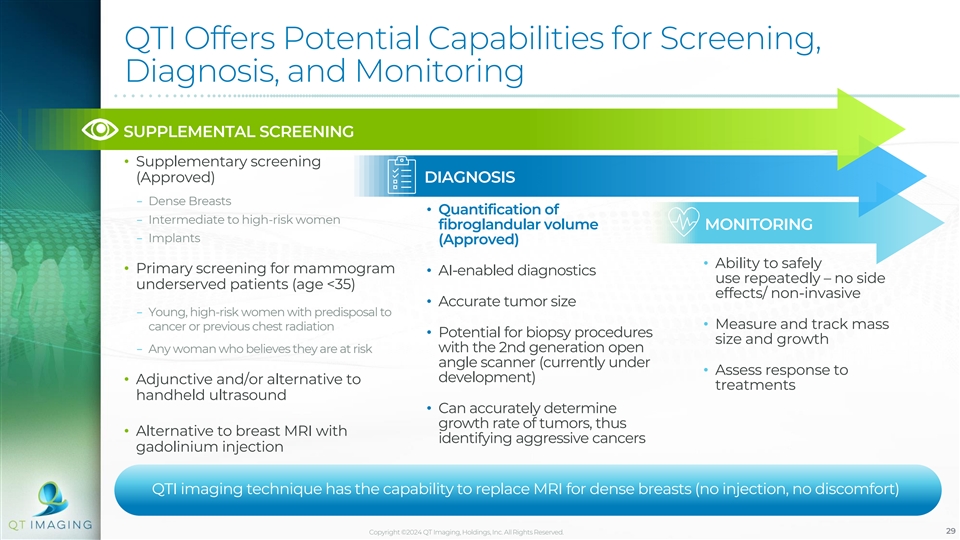 Current and Future Uses of QT Breast Scanner The QT Breast Scanner has been granted FDA clearances that allow for meaningful clinical use, with potential for a future roadmap to provide a replacement to screening mammography, a transformational milestone that would significantly expand the market opportunity FUTURE POTENTIAL APPLICATIONS NEAR-TERM: • Use applicability for determining breast density, measuring mass size and growth, and diagnosing lesions using artificial intelligence to expand into supplementary imaging market MEDIUM-TERM: • FDA has granted QT Scanner a Breakthrough Device Designation for screening younger and High-Risk women • Screening for High-Risk (Family History and Genes) Young Women: providing at-risk young women a safe, comfortable, and accurate method to screen for breast cancer LONG-TERM (MAJOR MILESTONE): • Alternative to Screening Mammography: our goal is to provide all women a safe, comfortable, and accurate method to screen for breast cancer (1) FDA | 510(k) Premarket Notification of Intent K220933 Copyright ©2024 QT Imaging, Holdings, Inc. All Rights Reserved. 28