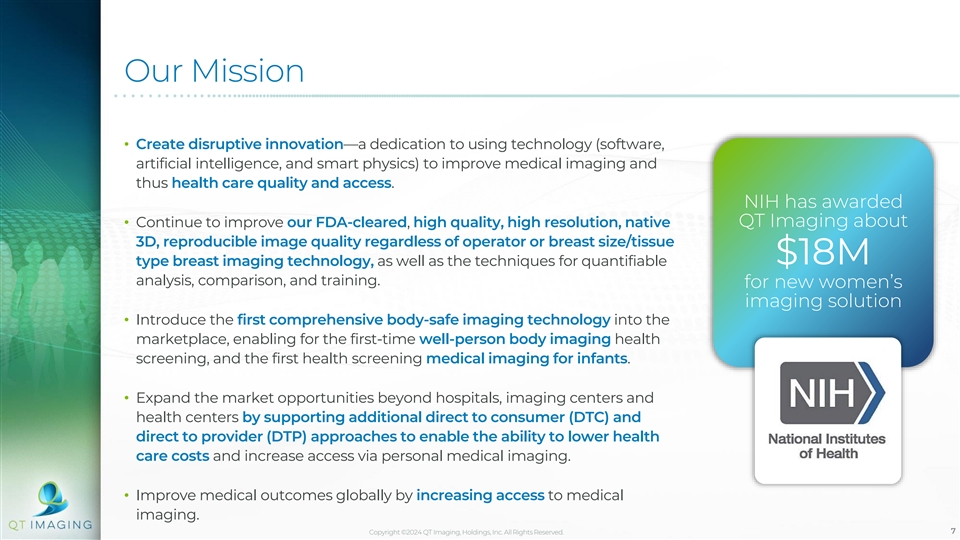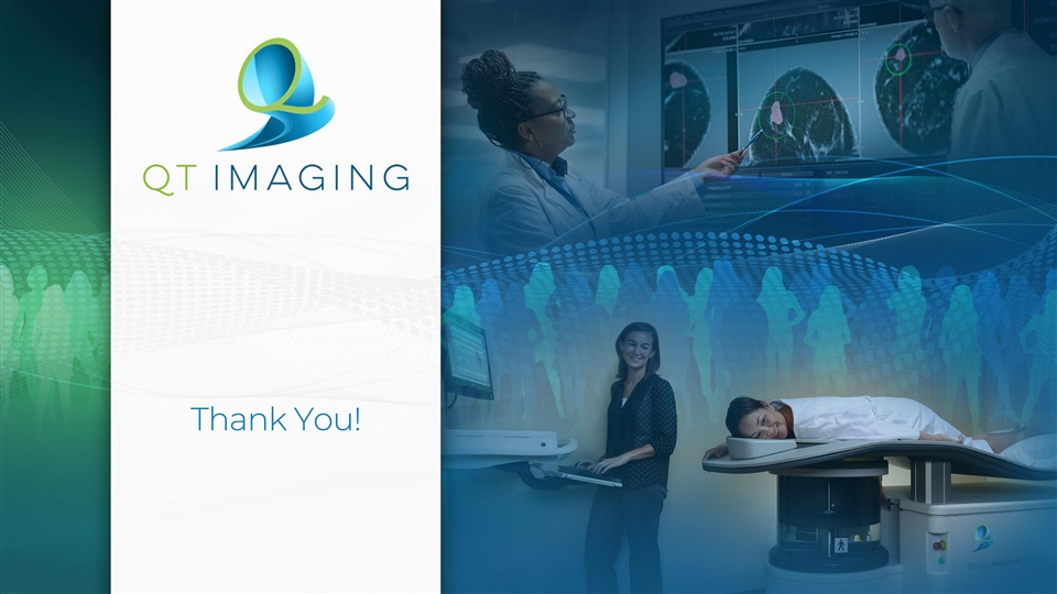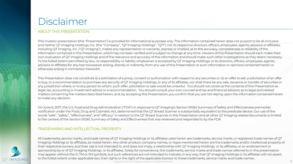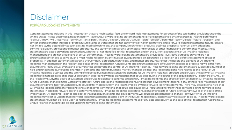 Disclaimer ABOUT THIS PRESENTATION This investor presentation (this “Presentation”) is provided for informational purposes only. The information contained herein does not purport to be all-inclusive and neither QT Imaging Holdings, Inc. (the “Company”, “QT Imaging Holdings”, “QTI”), nor its respective directors, officers, employees, agents, advisors or affiliates, including QT Imaging, Inc. (“QT Imaging”), makes any representation or warranty, express or implied, as to the accuracy, completeness or reliability of the information contained in this Presentation, which has not been verified and is subject to change at any time. Viewers of this Presentation should each make their own evaluation of QT Imaging Holdings and of the relevance and accuracy of the information and should make such other investigations as they deem necessary. To the fullest extent permitted by law, no responsibility or liability whatsoever is accepted by QT Imaging Holdings, or its directors, officers, employees, agents, advisors or affiliates for any loss howsoever arising, directly or indirectly, from any use of this Presentation or such information or opinions contained herein or otherwise arising in connection herewith. This Presentation does not constitute (i) a solicitation of a proxy, consent or authorization with respect to any securities or (ii) an offer to sell, a solicitation of an offer to buy, or a recommendation to purchase any security of QT Imaging Holdings, or any of its affiliates, nor shall there be any sale, issuance or transfer of securities in any jurisdiction where, or to any person to whom, such offer, solicitation or sale would be unlawful. You should not construe the contents of this Presentation as legal, tax, accounting or investment advice or a recommendation. You should consult your own counsel and tax and financial advisors as to legal and related matters concerning the matters described herein, and, by accepting this Presentation, you confirm that you are not relying upon the information contained herein to make any decision. On June 6, 2017, the U.S. Food and Drug Administration ( FDA ) in response to QT Imaging’s Section 510(k) Summary of Safety and Effectiveness premarket notification under the Food, Drug and Cosmetic Act, determined that the QT Breast Scanner is substantially equivalent to the predicate device. Our use of the words “safe”, “safety”, “effectiveness”, and “efficacy” in relation to the QT Breast Scanner in this Presentation and all other QT Imaging related documents is limited to the context of the Section 510(K) Summary of Safety and Effectiveness that was reviewed and responded to by the FDA. TRADEMARKS AND INTELLECTUAL PROPERTY All trademarks, service marks, and trade names of QT Imaging Holdings or its affiliates used herein are trademarks, service marks, or registered trade names of QT Imaging Holdings or its affiliates, as noted herein. Any other product, company names, or logos mentioned herein are the trademarks and/or intellectual property of their respective owners, and their use is not intended to, and does not imply, a relationship with QT Imaging Holdings or its affiliates, or an endorsement or sponsorship by or of QT Imaging Holdings or its affiliates. Solely for convenience, the trademarks, service marks and trade names referred to in this presentation may appear without the ®, TM or SM symbols, but such references are not intended to indicate, in any way, that QT Imaging Holdings or its affiliates will not assert, to the fullest extent under applicable law, their rights or the right of the applicable licensor to these trademarks, service marks and trade names. Copyright ©2024 QT Imaging Holdings, Inc. All Rights Reserved. 2