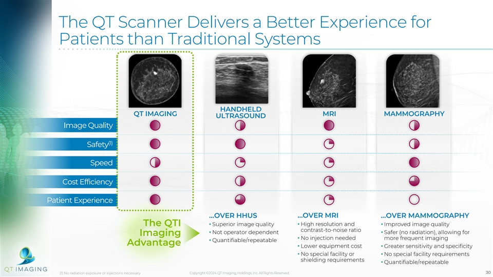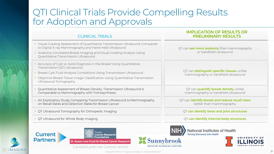 The QT Scanner Delivers a Better Experience for Patients than Traditional Systems HANDHELD QT IMAGING MRI MAMMOGRAPHY ULTRASOUND Image Quality (1) Safety Speed Cost Efficiency Patient Experience …OVER HHUS …OVER MRI ...OVER MAMMOGRAPHY The QTI • Superior image quality • High resolution and • Improved image quality contrast-to-noise ratio • Not operator dependent • Safer (no radiation), allowing for Imaging • No injection needed more frequent imaging • Quantifiable/repeatable Advantage • Lower equipment cost• Greater sensitivity and specificity • No special facility or • No special facility requirements shielding requirements • Quantifiable/repeatable (1) No radiation exposure or injections necessary Copyright ©2024 QT Imaging, Holdings, Inc. All Rights Reserved. 30