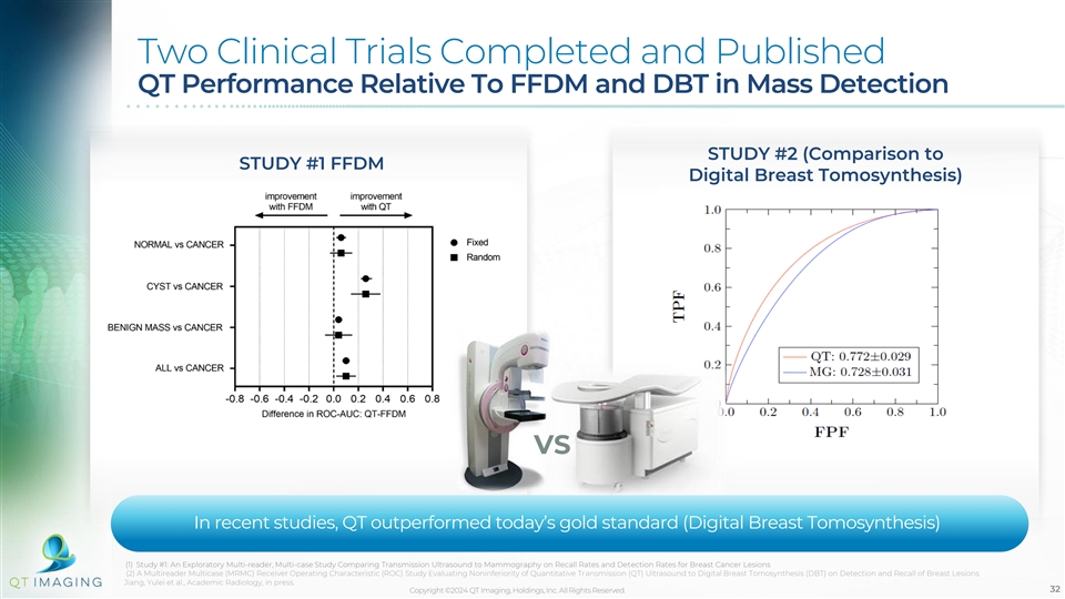 Two Clinical Trials Completed and Published QT Performance Relative To FFDM and DBT in Mass Detection STUDY #2 (Comparison to STUDY #1 FFDM Digital Breast Tomosynthesis) VS In recent studies, QT outperformed today’s gold standard (Digital Breast Tomosynthesis) (1) Study #1: An Exploratory Multi-reader, Multi-case Study Comparing Transmission Ultrasound to Mammography on Recall Rates and Detection Rates for Breast Cancer Lesions (2) A Multireader Multicase (MRMC) Receiver Operating Characteristic (ROC) Study Evaluating Noninferiority of Quantitative Transmission (QT) Ultrasound to Digital Breast Tomosynthesis (DBT) on Detection and Recall of Breast Lesions Jiang, Yulei et al., Academic Radiology, in press. Copyright ©2024 QT Imaging, Holdings, Inc. All Rights Reserved. 32