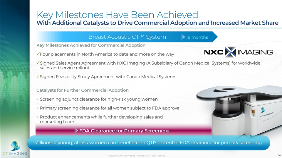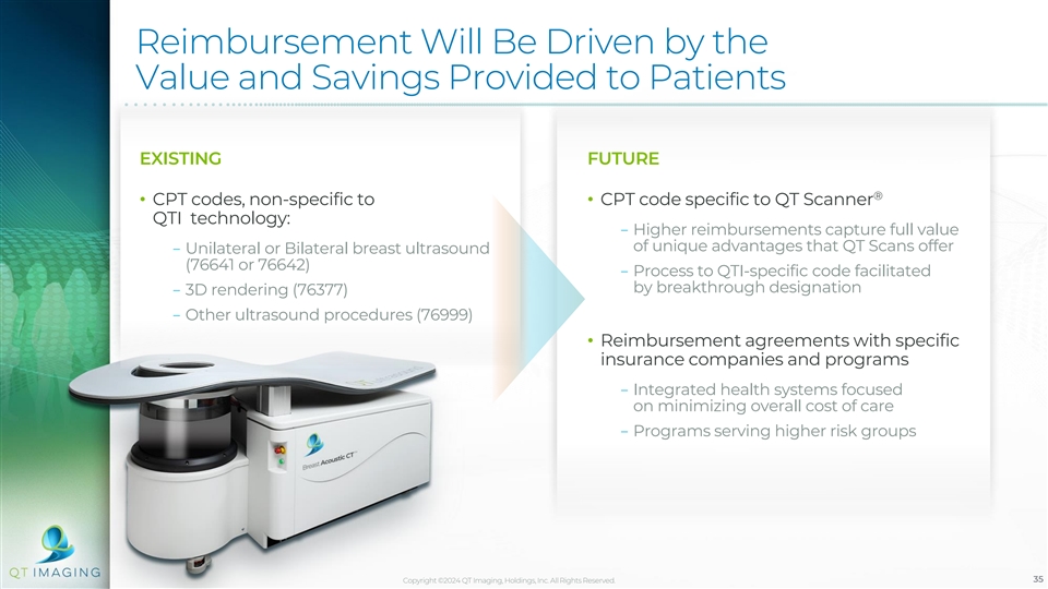 Key Milestones Have Been Achieved With Additional Catalysts to Drive Commercial Adoption and Increased Market Share Breast Acoustic CT System 18 months Key Milestones Achieved for Commercial Adoption ✓Four placements in North America to date and more on the way ✓Signed Sales Agent Agreement with NXC Imaging (A Subsidiary of Canon Medical Systems) for worldwide sales and service rollout ✓Signed Feasibility Study Agreement with Canon Medical Systems Catalysts for Further Commercial Adoption • Screening adjunct clearance for high-risk young women • Primary screening clearance for all women subject to FDA approval • Product enhancements while further developing sales and marketing team FDA Clearance for Primary Screening Millions of young, at-risk women can benefit from QTI’s potential FDA clearance for primary screening Copyright ©2024 QT Imaging, Holdings, Inc. All Rights Reserved. 34