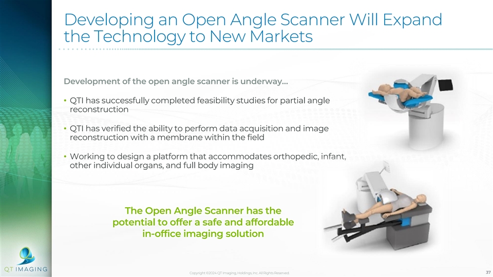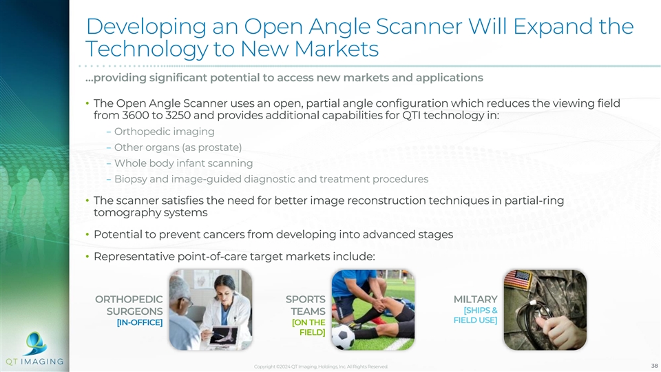 Developing an Open Angle Scanner Will Expand the Technology to New Markets Development of the open angle scanner is underway… • QTI has successfully completed feasibility studies for partial angle reconstruction • QTI has verified the ability to perform data acquisition and image reconstruction with a membrane within the field • Working to design a platform that accommodates orthopedic, infant, other individual organs, and full body imaging The Open Angle Scanner has the potential to offer a safe and affordable in-office imaging solution Copyright ©2024 QT Imaging, Holdings, Inc. All Rights Reserved. 37