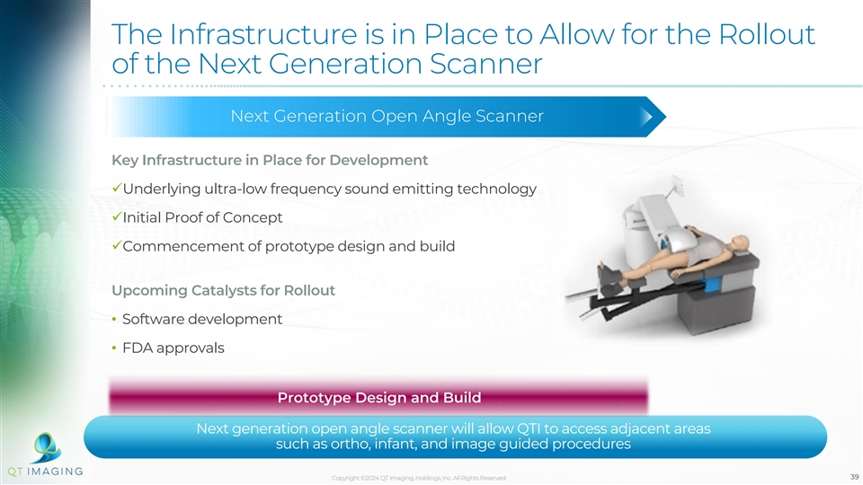 Developing an Open Angle Scanner Will Expand the Technology to New Markets …providing significant potential to access new markets and applications • The Open Angle Scanner uses an open, partial angle configuration which reduces the viewing field from 3600 to 3250 and provides additional capabilities for QTI technology in: − Orthopedic imaging − Other organs (as prostate) − Whole body infant scanning − Biopsy and image-guided diagnostic and treatment procedures • The scanner satisfies the need for better image reconstruction techniques in partial-ring tomography systems • Potential to prevent cancers from developing into advanced stages • Representative point-of-care target markets include: ORTHOPEDIC SPORTS MILTARY [SHIPS & SURGEONS TEAMS FIELD USE] [IN-OFFICE] [ON THE FIELD] Copyright ©2024 QT Imaging, Holdings, Inc. All Rights Reserved. 38