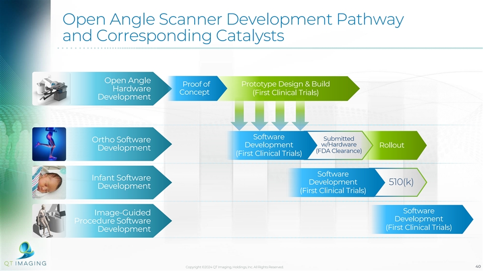 The Infrastructure is in Place to Allow for the Rollout of the Next Generation Scanner Next Generation Open Angle Scanner Key Infrastructure in Place for Development ✓Underlying ultra-low frequency sound emitting technology ✓Initial Proof of Concept ✓Commencement of prototype design and build Upcoming Catalysts for Rollout • Software development • FDA approvals Prototype Design and Build Next generation open angle scanner will allow QTI to access adjacent areas such as ortho, infant, and image guided procedures Copyright ©2024 QT Imaging, Holdings, Inc. All Rights Reserved. 39