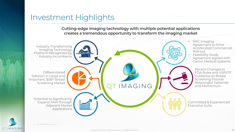 Open Angle Scanner Development Pathway and Corresponding Catalysts Open Angle Prototype Design & Build Proof of Hardware Concept (First Clinical Trials) Development Software Submitted 510(k) Ortho Software w/Hardware Development Rollout Development (FDA Clearance) (First Clinical Trials) Software Infant Software Development 510(k) Development (First Clinical Trials) Software Image-Guided Development Procedure Software (First Clinical Trials) Development Copyright ©2024 QT Imaging, Holdings, Inc. All Rights Reserved. 40