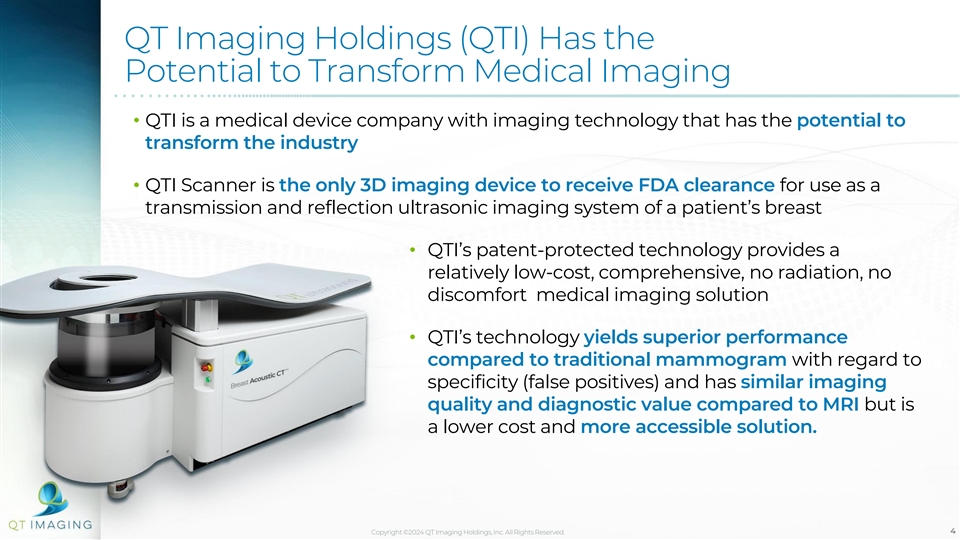 Disclaimer FORWARD LOOKING STATEMENTS Certain statements included in this Presentation that are not historical facts are forward-looking statements for purposes of the safe harbor provisions under the United States Private Securities Litigation Reform Act of 1995. Forward-looking statements generally are accompanied by words such as “has the potential to”, “believe”, “may”, “will”, “estimate”, “continue”, “anticipate”, “intend”, “expect”, “should”, “would”, “plan”, “predict”, “potential”, “seem”, “seek”, “future”, “outlook”, and similar expressions that indicate or predict future events or trends that are not statements of historical matters. These forward looking statements include, but are not limited to, the potential impact on existing medical technology, the company’s technology, products, business prospects, revenue, client adoptions, commercialization, projections of market opportunity and statements regarding estimates and forecasts of other financial and performance metrics. These statements are based on various assumptions, whether or not identified in this Presentation, and on the current expectations of QT Imaging Holdings’ management and are not predictions of actual performance. These forward-looking statements are provided for illustrative purposes only and are not circumstances intended to serve as, and must not be relied on by any investor as, a guarantee, an assurance, a prediction or a definitive statement of fact or probability. In addition, statements regarding the Company’s products, technology, and market opportunity reflect the beliefs and opinions of QT Imaging Holdings’ management on the relevant subject as of this Presentation. Actual events and circumstances are difficult or impossible to predict and will differ from assumptions. Many actual events and circumstances are beyond the control of QT Imaging Holdings. These forward-looking statements are subject to a number of risks and uncertainties, including changes in domestic and foreign business, market, financial, political and legal conditions; risks related to the rollout of QT Imaging Holdings’ business and the timing of expected business milestones; the demand for QT Imaging Holdings’ products and services; the ability of QT Imaging Holdings to increase sales of its output products in accordance with its plans; issues that could arise during the course of the acquisition of QT scanners by CMSC or the Feasibility Study; the desire of customers and service recipients to continue engaging QT Imaging Holdings; the effects of competition on QT Imaging Holdings’ future business, changes in the Company’s strategy, future operations, financial positions, and product development timeline. If any of these risks materialize or our assumptions prove incorrect, actual results could differ materially from the results implied by these forward-looking statements. There may be additional risks that QT Imaging Holdings presently does not know or believes is immaterial that could also cause actual results to differ from those contained in the forward-looking statements. In addition, forward-looking statements reflect QT Imaging Holdings’ expectations, plans or forecasts of future events and views as of the date of this Presentation. QT Imaging Holdings anticipates that subsequent events and developments will cause its assessments to change. However, while QT Imaging Holdings may elect to update these forward-looking statements at some point in the future, its specifically disclaims any obligation to do so. These forward-looking statements should not be relied upon as representing QT Imaging Holdings’ assessments as of any date subsequent to the date of this Presentation. Accordingly, undue reliance should not be placed upon the forward-looking statements. Copyright ©2024 QT Imaging Holdings, Inc. All Rights Reserved. 3