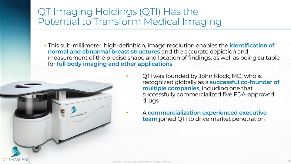 QT Imaging Holdings (QTI) Has the Potential to Transform Medical Imaging • QTI is a medical device company with imaging technology that has the potential to transform the industry • QTI Scanner is the only 3D imaging device to receive FDA clearance for use as a transmission and reflection ultrasonic imaging system of a patient’s breast • QTI’s patent-protected technology provides a relatively low-cost, comprehensive, no radiation, no discomfort medical imaging solution • QTI’s technology yields superior performance compared to traditional mammogram with regard to specificity (false positives) and has similar imaging quality and diagnostic value compared to MRI but is a lower cost and more accessible solution. Copyright ©2024 QT Imaging Holdings, Inc. All Rights Reserved. 4
