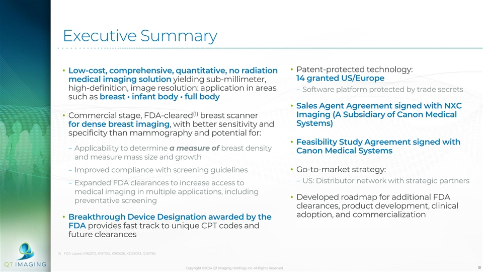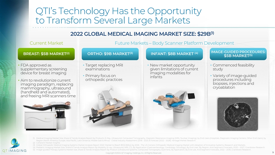 Executive Summary • Patent-protected technology: • Low-cost, comprehensive, quantitative, no radiation 14 granted US/Europe medical imaging solution yielding sub-millimeter, high-definition, image resolution: application in areas − Software platform protected by trade secrets such as breast • infant body • full body • Sales Agent Agreement signed with NXC (1) Imaging (A Subsidiary of Canon Medical • Commercial stage, FDA-cleared breast scanner Systems) for dense breast imaging, with better sensitivity and specificity than mammography and potential for: • Feasibility Study Agreement signed with − Applicability to determine a measure of breast density Canon Medical Systems and measure mass size and growth − Improved compliance with screening guidelines• Go-to-market strategy: − US: Distributor network with strategic partners − Expanded FDA clearances to increase access to medical imaging in multiple applications, including • Developed roadmap for additional FDA preventative screening clearances, product development, clinical adoption, and commercialization • Breakthrough Device Designation awarded by the FDA provides fast track to unique CPT codes and future clearances (1) FDA Labels: K162372, K181785, K190626, KD22093, Q181785 Copyright ©2024 QT Imaging, Holdings, Inc. All Rights Reserved. 8