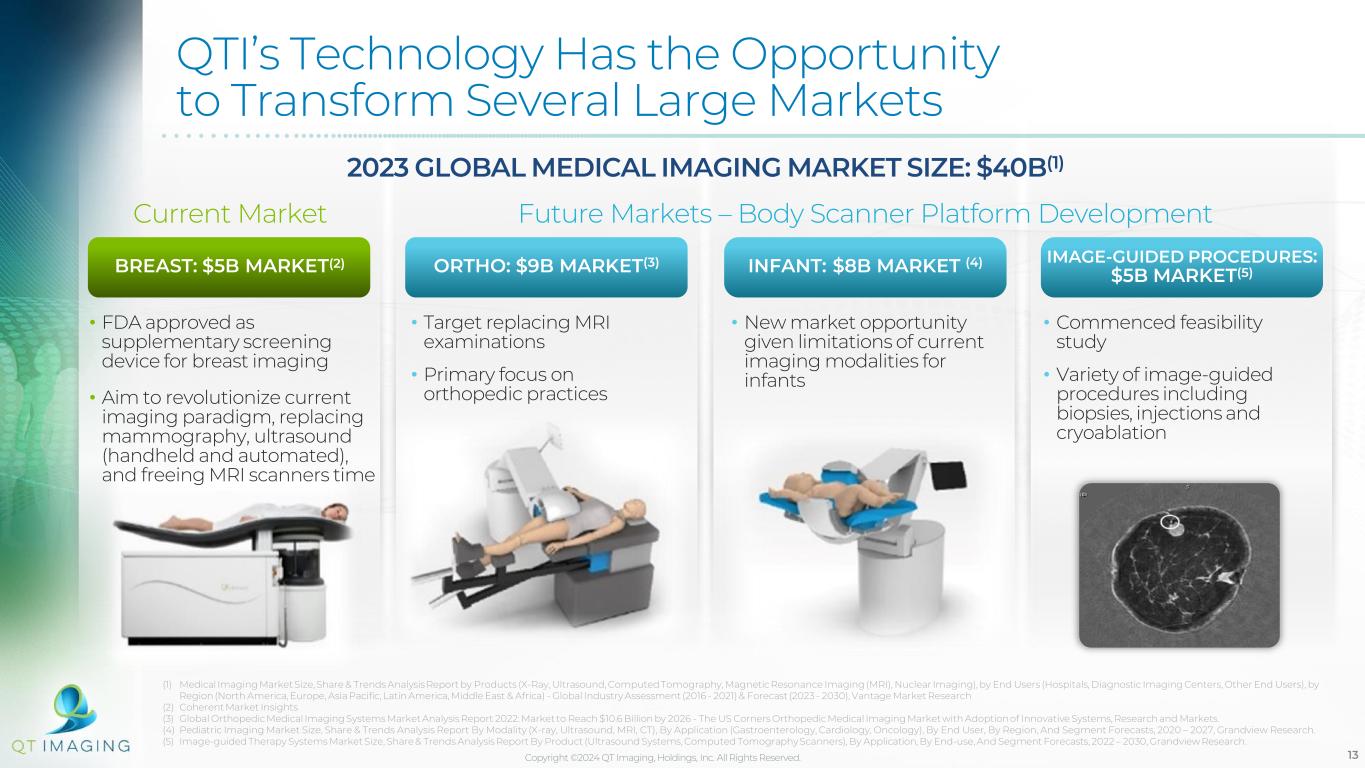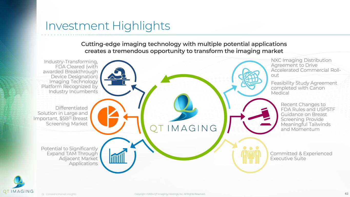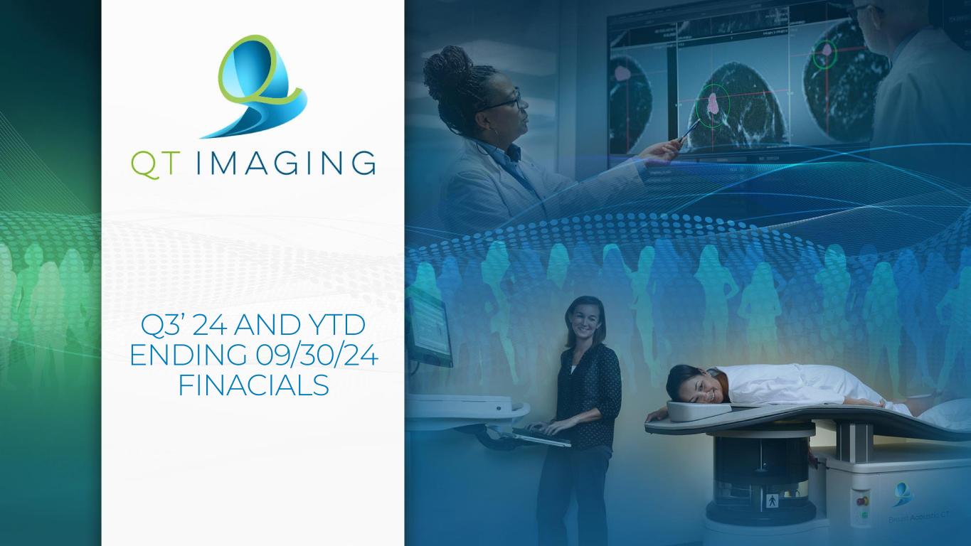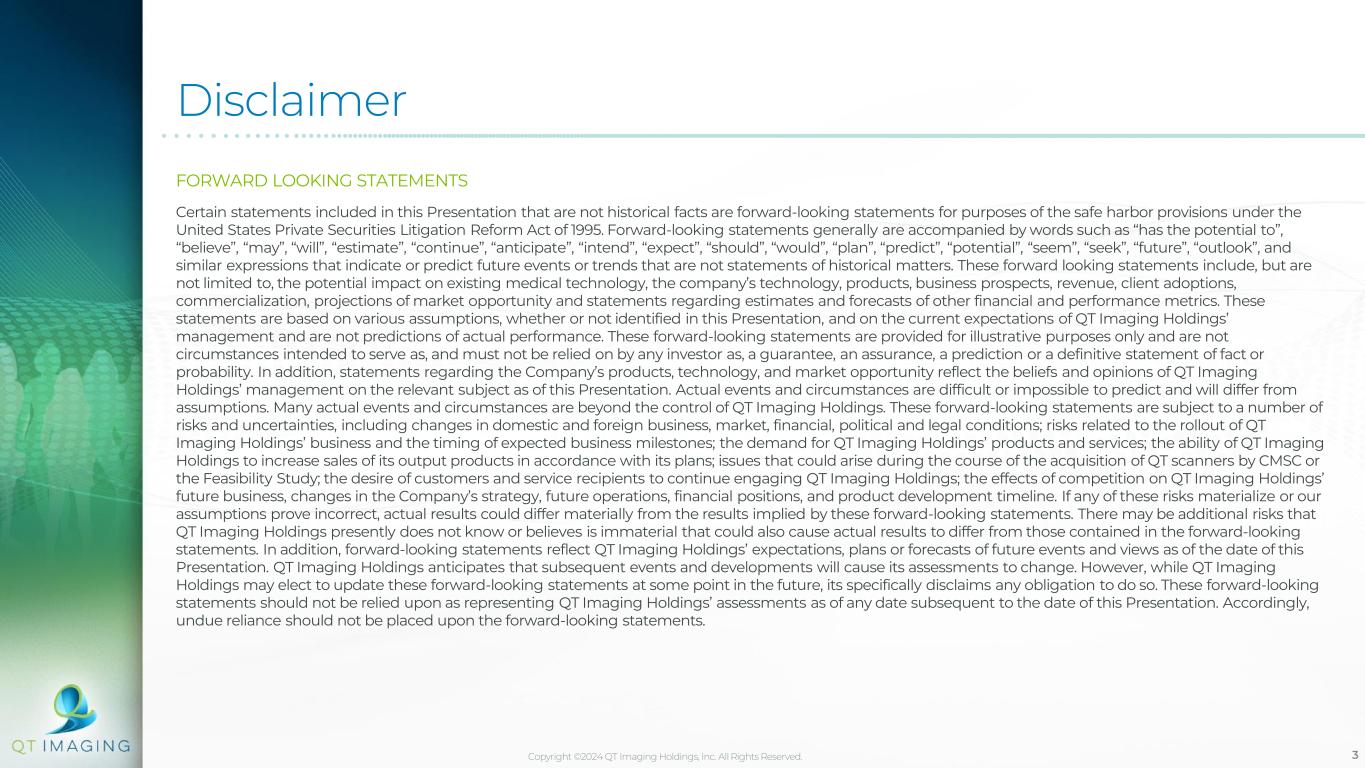 2 Disclaimer ABOUT THIS PRESENTATION This investor presentation (this “Presentation”) is provided for informational purposes only. The information contained herein does not purport to be all-inclusive and neither QT Imaging Holdings, Inc. (the “Company”, “QT Imaging Holdings”, “QTI”), nor its respective directors, officers, employees, agents, advisors or affiliates, including QT Imaging, Inc. (“QT Imaging”), makes any representation or warranty, express or implied, as to the accuracy, completeness or reliability of the information contained in this Presentation, which has not been verified and is subject to change at any time. Viewers of this Presentation should each make their own evaluation of QT Imaging Holdings and of the relevance and accuracy of the information and should make such other investigations as they deem necessary. To the fullest extent permitted by law, no responsibility or liability whatsoever is accepted by QT Imaging Holdings, or its directors, officers, employees, agents, advisors or affiliates for any loss howsoever arising, directly or indirectly, from any use of this Presentation or such information or opinions contained herein or otherwise arising in connection herewith. This Presentation does not constitute (i) a solicitation of a proxy, consent or authorization with respect to any securities or (ii) an offer to sell, a solicitation of an offer to buy, or a recommendation to purchase any security of QT Imaging Holdings, or any of its affiliates, nor shall there be any sale, issuance or transfer of securities in any jurisdiction where, or to any person to whom, such offer, solicitation or sale would be unlawful. You should not construe the contents of this Presentation as legal, tax, accounting or investment advice or a recommendation. You should consult your own counsel and tax and financial advisors as to legal and related matters concerning the matters described herein, and, by accepting this Presentation, you confirm that you are not relying upon the information contained herein to make any decision. On June 6, 2017, the U.S. Food and Drug Administration ("FDA") in response to QT Imaging’s Section 510(k) Summary of Safety and Effectiveness premarket notification under the Food, Drug and Cosmetic Act, determined that the QT Breast Scanner is substantially equivalent to the predicate device. Our use of the words “safe”, “safety”, “effectiveness”, and “efficacy” in relation to the QT Breast Scanner in this Presentation and all other QT Imaging related documents is limited to the context of the Section 510(K) Summary of Safety and Effectiveness that was reviewed and responded to by the FDA. TRADEMARKS AND INTELLECTUAL PROPERTY All trademarks, service marks, and trade names of QT Imaging Holdings or its affiliates used herein are trademarks, service marks, or registered trade names of QT Imaging Holdings or its affiliates, as noted herein. Any other product, company names, or logos mentioned herein are the trademarks and/or intellectual property of their respective owners, and their use is not intended to, and does not imply, a relationship with QT Imaging Holdings or its affiliates, or an endorsement or sponsorship by or of QT Imaging Holdings or its affiliates. Solely for convenience, the trademarks, service marks and trade names referred to in this presentation may appear without the ®, TM or SM symbols, but such references are not intended to indicate, in any way, that QT Imaging Holdings or its affiliates will not assert, to the fullest extent under applicable law, their rights or the right of the applicable licensor to these trademarks, service marks and trade names. Copyright ©2024 QT Imaging Holdings, Inc. All Rights Reserved.