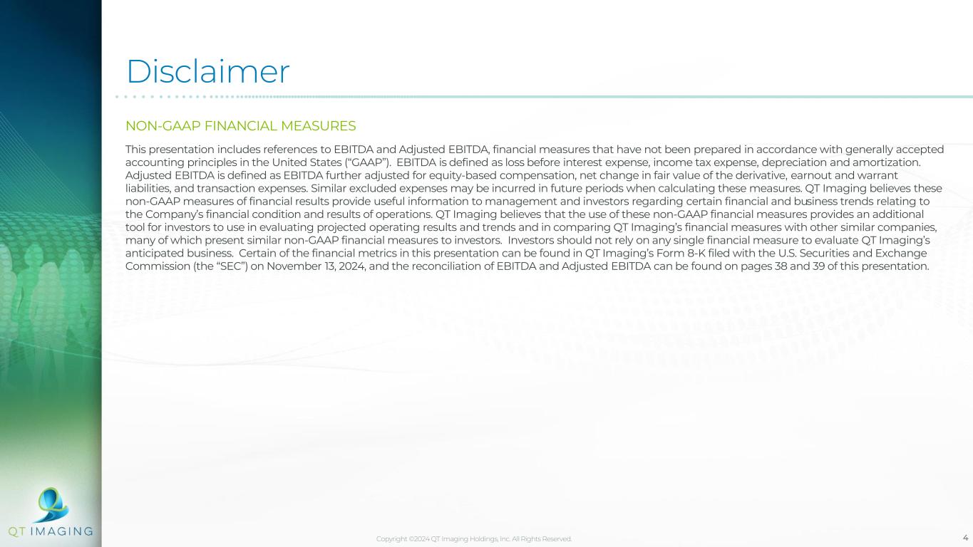 3 Disclaimer FORWARD LOOKING STATEMENTS Certain statements included in this Presentation that are not historical facts are forward-looking statements for purposes of the safe harbor provisions under the United States Private Securities Litigation Reform Act of 1995. Forward-looking statements generally are accompanied by words such as “has the potential to”, “believe”, “may”, “will”, “estimate”, “continue”, “anticipate”, “intend”, “expect”, “should”, “would”, “plan”, “predict”, “potential”, “seem”, “seek”, “future”, “outlook”, and similar expressions that indicate or predict future events or trends that are not statements of historical matters. These forward looking statements include, but are not limited to, the potential impact on existing medical technology, the company’s technology, products, business prospects, revenue, client adoptions, commercialization, projections of market opportunity and statements regarding estimates and forecasts of other financial and performance metrics. These statements are based on various assumptions, whether or not identified in this Presentation, and on the current expectations of QT Imaging Holdings’ management and are not predictions of actual performance. These forward-looking statements are provided for illustrative purposes only and are not circumstances intended to serve as, and must not be relied on by any investor as, a guarantee, an assurance, a prediction or a definitive statement of fact or probability. In addition, statements regarding the Company’s products, technology, and market opportunity reflect the beliefs and opinions of QT Imaging Holdings’ management on the relevant subject as of this Presentation. Actual events and circumstances are difficult or impossible to predict and will differ from assumptions. Many actual events and circumstances are beyond the control of QT Imaging Holdings. These forward-looking statements are subject to a number of risks and uncertainties, including changes in domestic and foreign business, market, financial, political and legal conditions; risks related to the rollout of QT Imaging Holdings’ business and the timing of expected business milestones; the demand for QT Imaging Holdings’ products and services; the ability of QT Imaging Holdings to increase sales of its output products in accordance with its plans; issues that could arise during the course of the acquisition of QT scanners by CMSC or the Feasibility Study; the desire of customers and service recipients to continue engaging QT Imaging Holdings; the effects of competition on QT Imaging Holdings’ future business, changes in the Company’s strategy, future operations, financial positions, and product development timeline. If any of these risks materialize or our assumptions prove incorrect, actual results could differ materially from the results implied by these forward-looking statements. There may be additional risks that QT Imaging Holdings presently does not know or believes is immaterial that could also cause actual results to differ from those contained in the forward-looking statements. In addition, forward-looking statements reflect QT Imaging Holdings’ expectations, plans or forecasts of future events and views as of the date of this Presentation. QT Imaging Holdings anticipates that subsequent events and developments will cause its assessments to change. However, while QT Imaging Holdings may elect to update these forward-looking statements at some point in the future, its specifically disclaims any obligation to do so. These forward-looking statements should not be relied upon as representing QT Imaging Holdings’ assessments as of any date subsequent to the date of this Presentation. Accordingly, undue reliance should not be placed upon the forward-looking statements. Copyright ©2024 QT Imaging Holdings, Inc. All Rights Reserved.