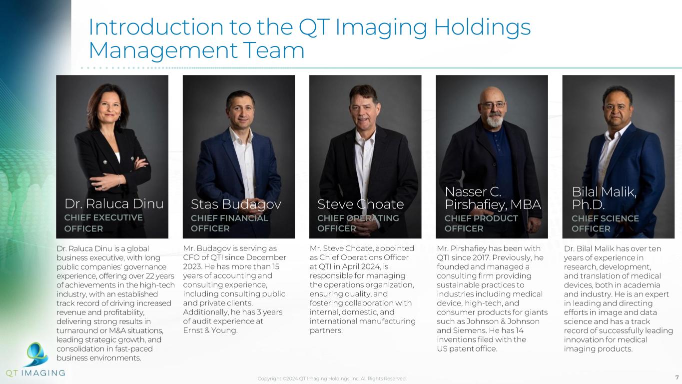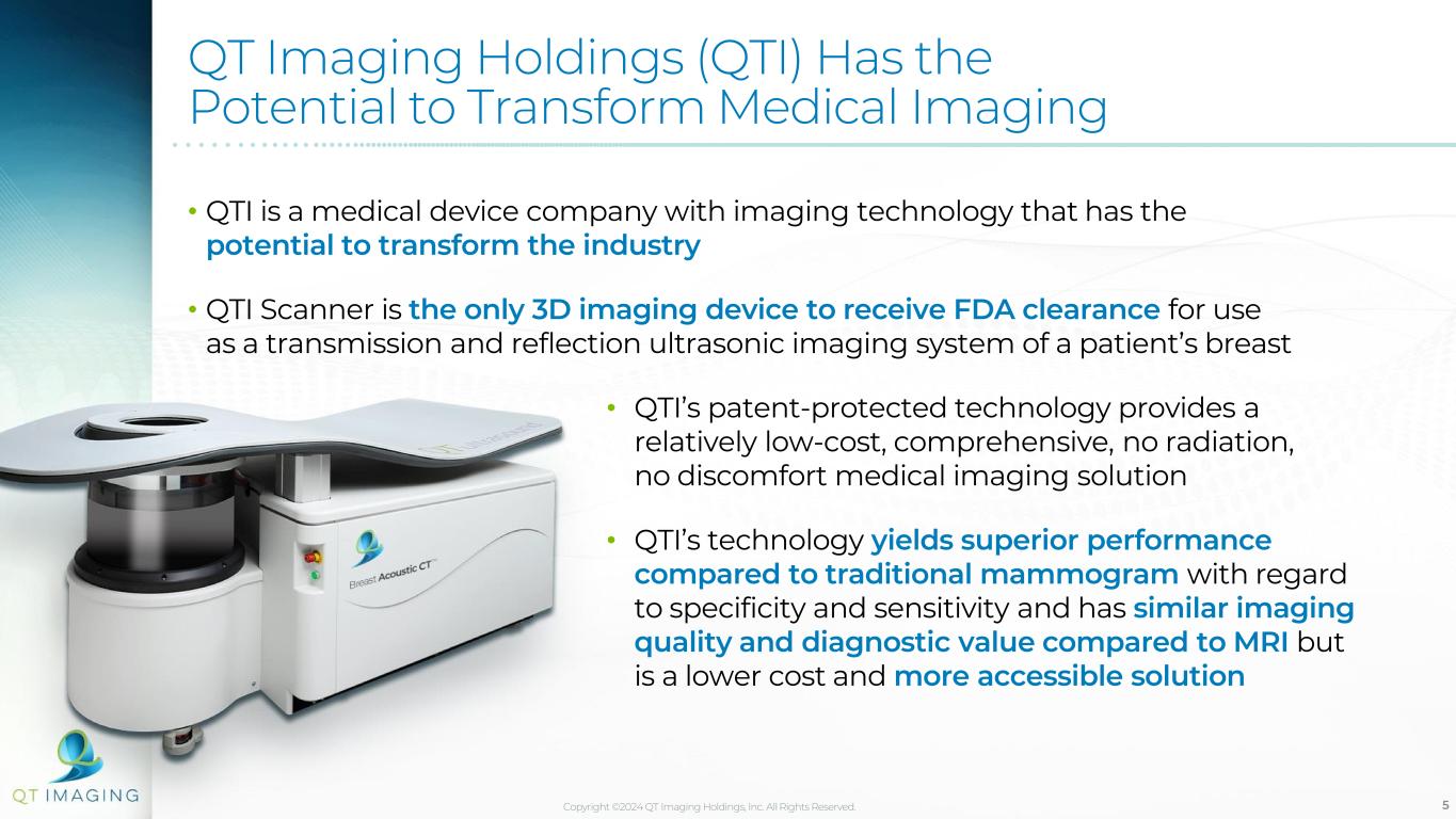 4 Disclaimer NON-GAAP FINANCIAL MEASURES This presentation includes references to EBITDA and Adjusted EBITDA, financial measures that have not been prepared in accordance with generally accepted accounting principles in the United States (“GAAP”). EBITDA is defined as loss before interest expense, income tax expense, depreciation and amortization. Adjusted EBITDA is defined as EBITDA further adjusted for equity-based compensation, net change in fair value of the derivative, earnout and warrant liabilities, and transaction expenses. Similar excluded expenses may be incurred in future periods when calculating these measures. QT Imaging believes these non-GAAP measures of financial results provide useful information to management and investors regarding certain financial and business trends relating to the Company’s financial condition and results of operations. QT Imaging believes that the use of these non-GAAP financial measures provides an additional tool for investors to use in evaluating projected operating results and trends and in comparing QT Imaging’s financial measures with other similar companies, many of which present similar non-GAAP financial measures to investors. Investors should not rely on any single financial measure to evaluate QT Imaging’s anticipated business. Certain of the financial metrics in this presentation can be found in QT Imaging’s Form 8-K filed with the U.S. Securities and Exchange Commission (the “SEC”) on November 13, 2024, and the reconciliation of EBITDA and Adjusted EBITDA can be found on pages 38 and 39 of this presentation. Copyright ©2024 QT Imaging Holdings, Inc. All Rights Reserved.