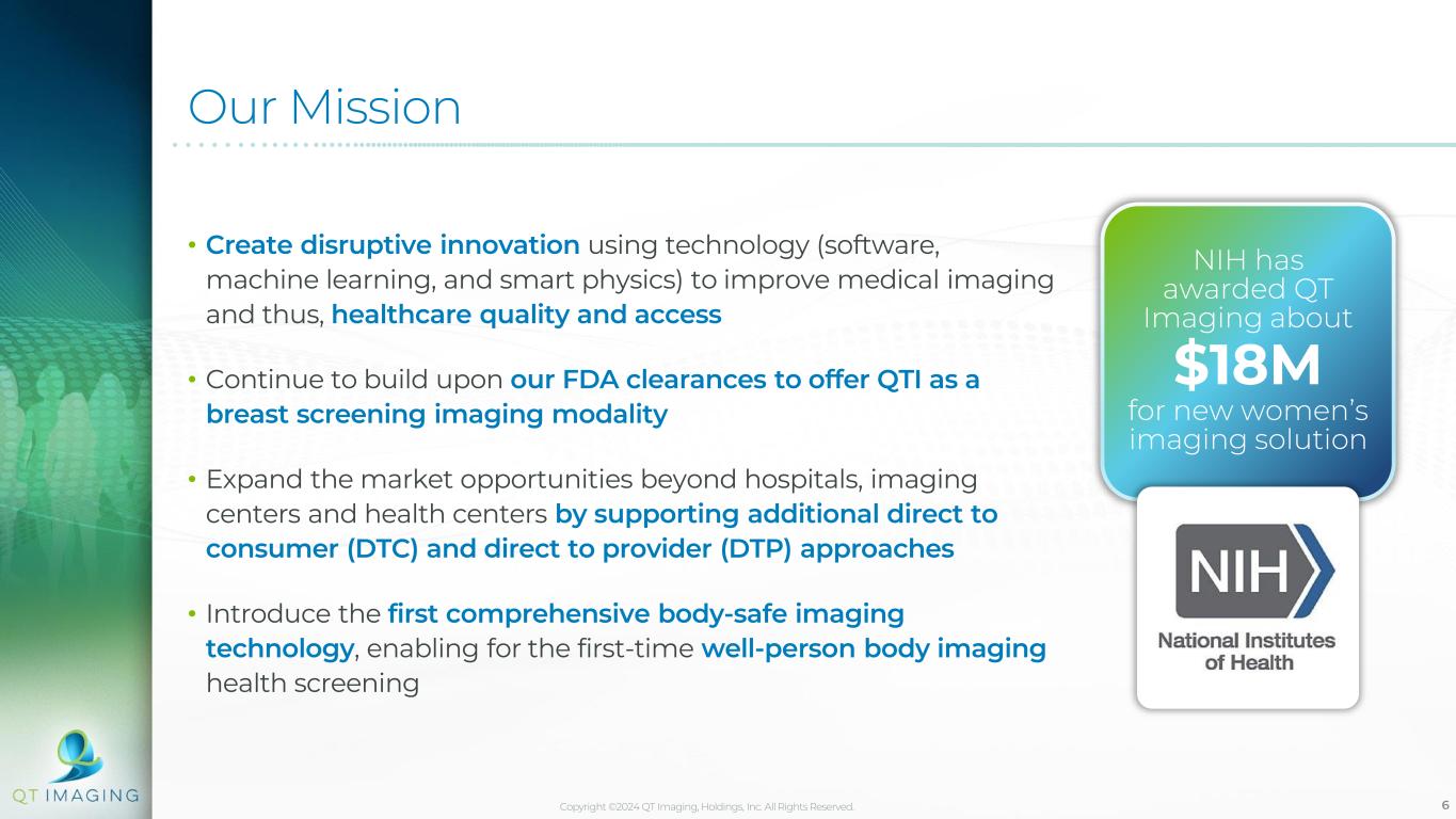 5 QT Imaging Holdings (QTI) Has the Potential to Transform Medical Imaging • QTI is a medical device company with imaging technology that has the potential to transform the industry • QTI Scanner is the only 3D imaging device to receive FDA clearance for use as a transmission and reflection ultrasonic imaging system of a patient’s breast • QTI’s patent-protected technology provides a relatively low-cost, comprehensive, no radiation, no discomfort medical imaging solution • QTI’s technology yields superior performance compared to traditional mammogram with regard to specificity and sensitivity and has similar imaging quality and diagnostic value compared to MRI but is a lower cost and more accessible solution Copyright ©2024 QT Imaging Holdings, Inc. All Rights Reserved.