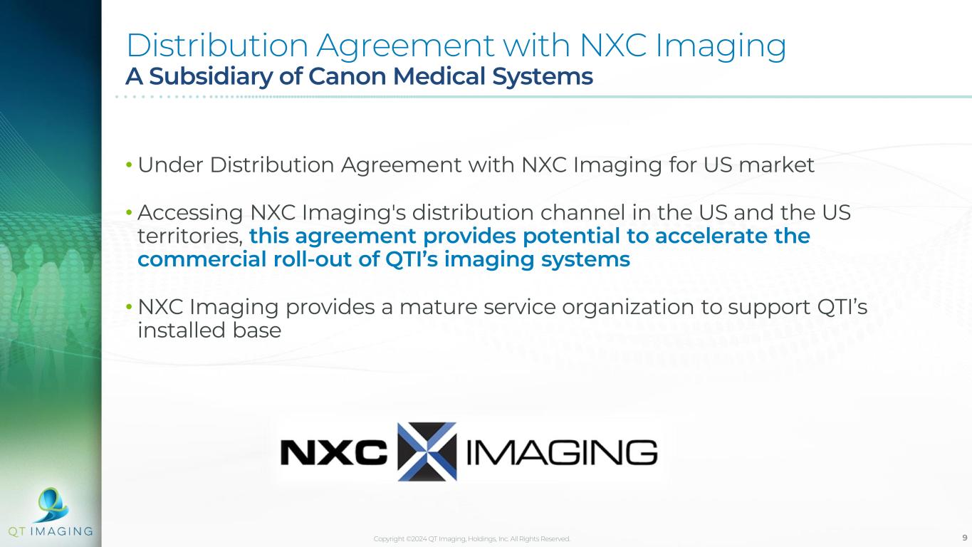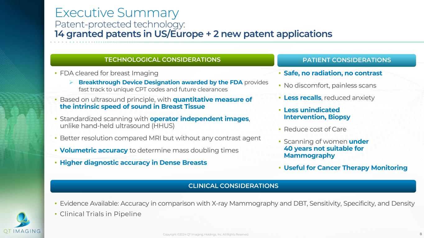 8 • FDA cleared for breast Imaging ➢ Breakthrough Device Designation awarded by the FDA provides fast track to unique CPT codes and future clearances • Based on ultrasound principle, with quantitative measure of the intrinsic speed of sound in Breast Tissue • Standardized scanning with operator independent images, unlike hand-held ultrasound (HHUS) • Better resolution compared MRI but without any contrast agent • Volumetric accuracy to determine mass doubling times • Higher diagnostic accuracy in Dense Breasts • Safe, no radiation, no contrast • No discomfort, painless scans • Less recalls, reduced anxiety • Less unindicated Intervention, Biopsy • Reduce cost of Care • Scanning of women under 40 years not suitable for Mammography • Useful for Cancer Therapy Monitoring Executive Summary Patent-protected technology: 14 granted patents in US/Europe + 2 new patent applications TECHNOLOGICAL CONSIDERATIONS PATIENT CONSIDERATIONS • Evidence Available: Accuracy in comparison with X-ray Mammography and DBT, Sensitivity, Specificity, and Density • Clinical Trials in Pipeline CLINICAL CONSIDERATIONS Copyright ©2024 QT Imaging, Holdings, Inc. All Rights Reserved.