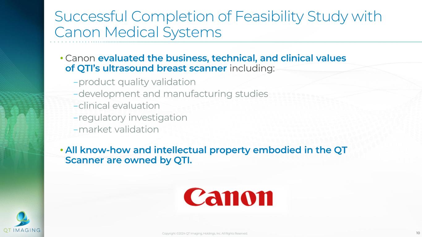 9 Distribution Agreement with NXC Imaging A Subsidiary of Canon Medical Systems • Under Distribution Agreement with NXC Imaging for US market • Accessing NXC Imaging's distribution channel in the US and the US territories, this agreement provides potential to accelerate the commercial roll-out of QTI’s imaging systems • NXC Imaging provides a mature service organization to support QTI’s installed base Copyright ©2024 QT Imaging, Holdings, Inc. All Rights Reserved.