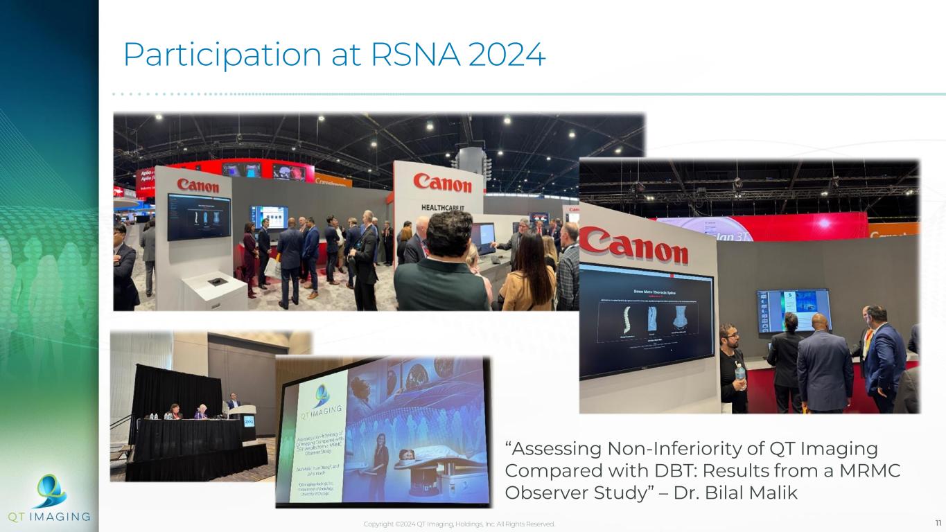 10 Successful Completion of Feasibility Study with Canon Medical Systems • Canon evaluated the business, technical, and clinical values of QTI’s ultrasound breast scanner including: −product quality validation −development and manufacturing studies −clinical evaluation −regulatory investigation −market validation • All know-how and intellectual property embodied in the QT Scanner are owned by QTI. Copyright ©2024 QT Imaging, Holdings, Inc. All Rights Reserved.