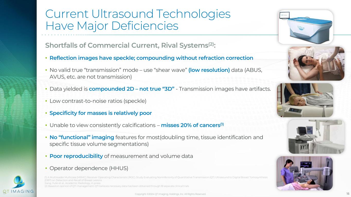 14 INVENIA ABUS ACUSON S2000 ABVS AWBUS SOFIA 3D DELPHINUS SOFTVUE BREAST ACOUSTIC CT DESIGN TYPE Articulating Arm Articulating Arm Articulating Arm Guided Handheld Rotating Armature Water Bath Water Bath OUTPUT Stacked 2D Reflection Slices Stacked 2D Reflection Slices Stacked 2D Reflection Slices Stacked 2D Reflection Slices Stacked 2D Slices Only Full 3D Other Ultrasound Products Use 2D Imaging for Dense Breast Screening (1) Integration of Handheld Ultrasound or Automated Breast Ultrasound among Women with Negative Mammographic Screening Findings: A Multi-center Population-based Study in China Source: Manufacturer’s websites Mammography is ineffective in screening dense breasts. Ultrasound techniques performed after MRI did not detect additional cancer(1) in dense breast Copyright ©2024 QT Imaging, Holdings, Inc. All Rights Reserved.