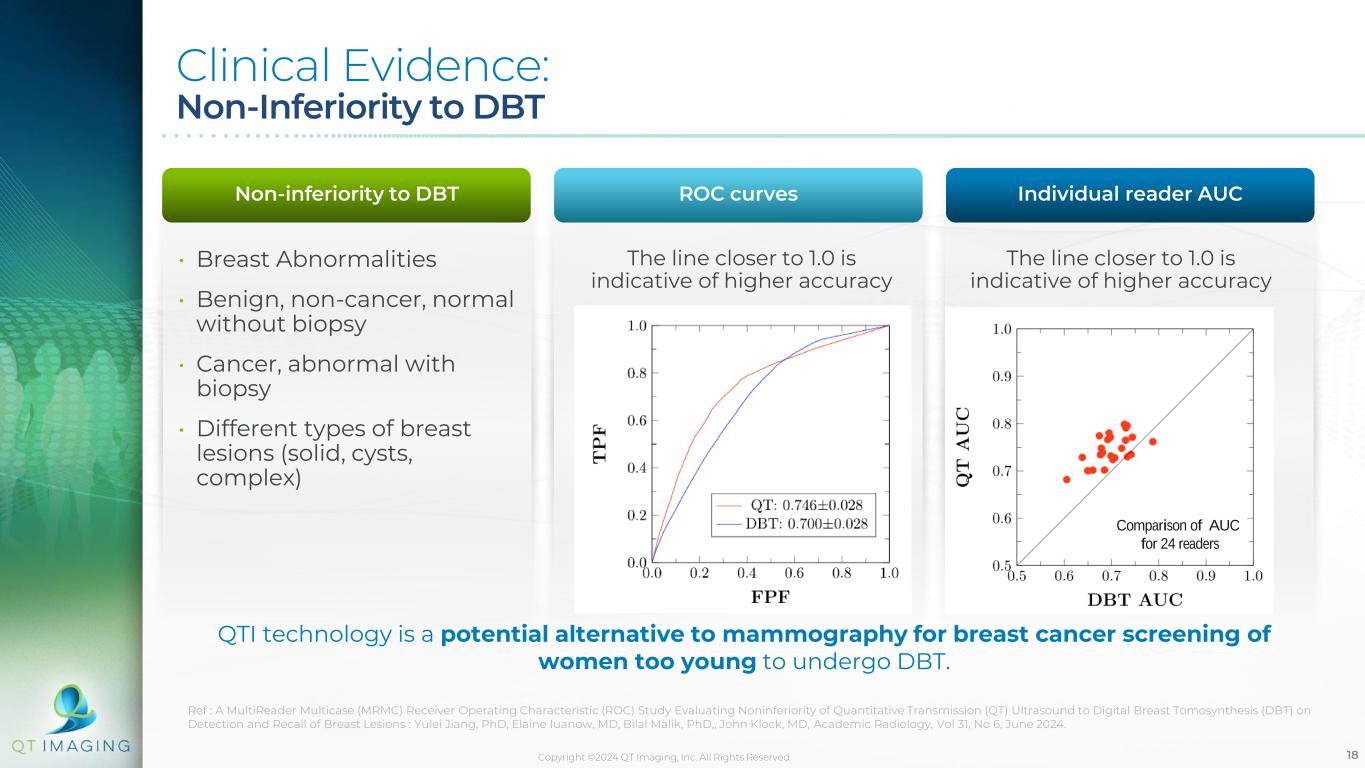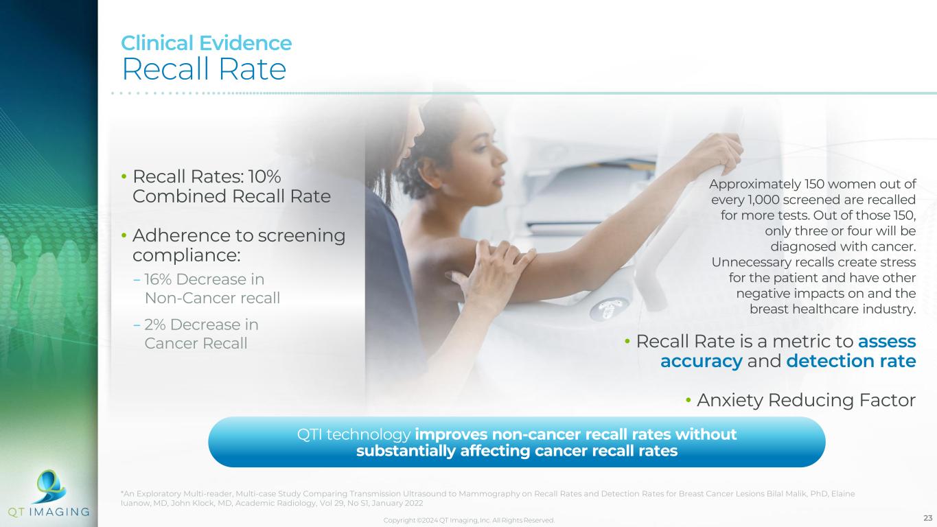 23Copyright ©2024 QT Imaging, Inc. All Rights Reserved. • Recall Rates: 10% Combined Recall Rate • Adherence to screening compliance: − 16% Decrease in Non-Cancer recall − 2% Decrease in Cancer Recall Clinical Evidence Recall Rate Approximately 150 women out of every 1,000 screened are recalled for more tests. Out of those 150, only three or four will be diagnosed with cancer. Unnecessary recalls create stress for the patient and have other negative impacts on and the breast healthcare industry. • Recall Rate is a metric to assess accuracy and detection rate • Anxiety Reducing Factor QTI technology improves non-cancer recall rates without substantially affecting cancer recall rates *An Exploratory Multi-reader, Multi-case Study Comparing Transmission Ultrasound to Mammography on Recall Rates and Detection Rates for Breast Cancer Lesions Bilal Malik, PhD, Elaine Iuanow, MD, John Klock, MD, Academic Radiology, Vol 29, No S1, January 2022
