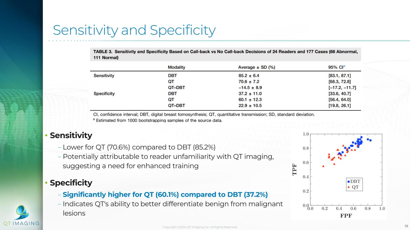 18Copyright ©2024 QT Imaging, Inc. All Rights Reserved. Clinical Evidence: Non-Inferiority to DBT QTI technology is a potential alternative to mammography for breast cancer screening of women too young to undergo DBT. The line closer to 1.0 is indicative of higher accuracy • Breast Abnormalities • Benign, non-cancer, normal without biopsy • Cancer, abnormal with biopsy • Different types of breast lesions (solid, cysts, complex) The line closer to 1.0 is indicative of higher accuracy Ref : A MultiReader Multicase (MRMC) Receiver Operating Characteristic (ROC) Study Evaluating Noninferiority of Quantitative Transmission (QT) Ultrasound to Digital Breast Tomosynthesis (DBT) on Detection and Recall of Breast Lesions : Yulei Jiang, PhD, Elaine Iuanow, MD, Bilal Malik, PhD,, John Klock, MD, Academic Radiology, Vol 31, No 6, June 2024. Non-inferiority to DBT ROC curves Individual reader AUC Comparison of AUC for 24 readers