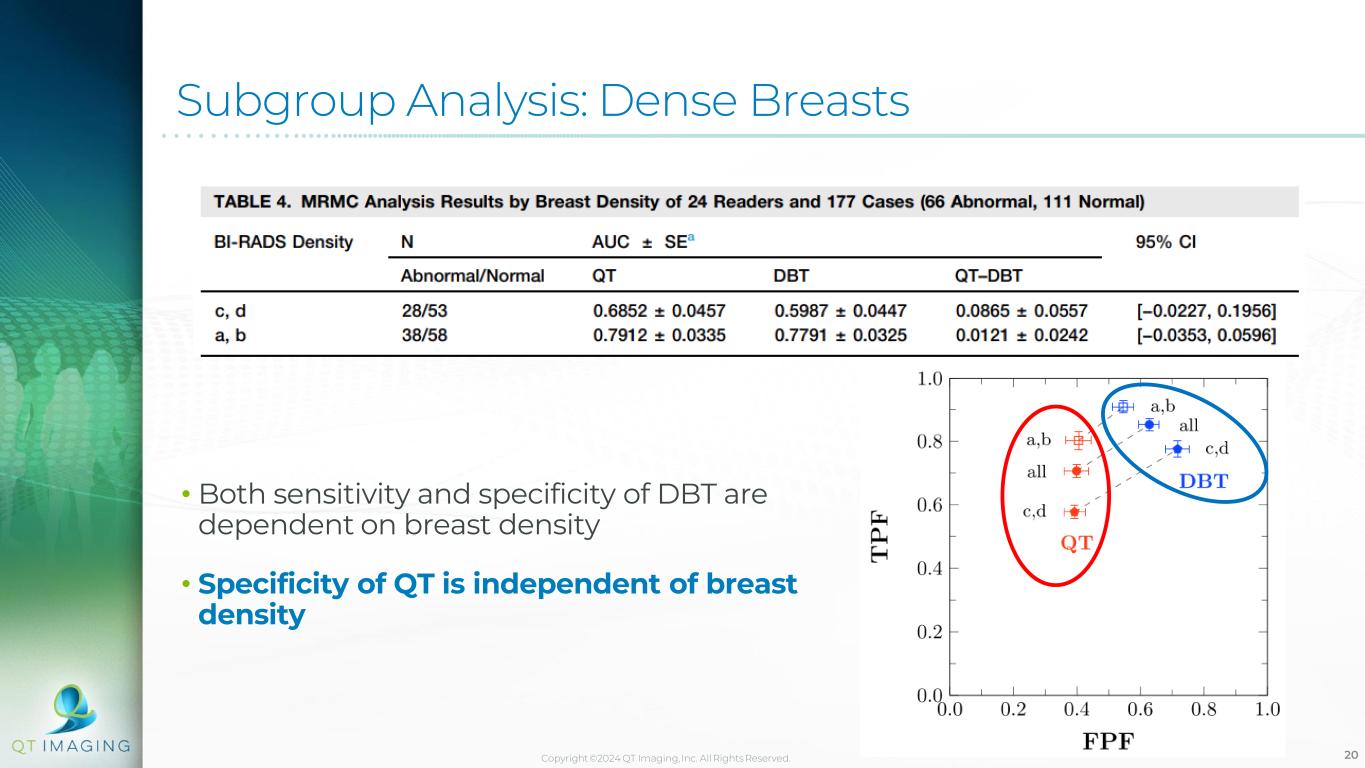 19Copyright ©2024 QT Imaging, Inc. All Rights Reserved. • Sensitivity − Lower for QT (70.6%) compared to DBT (85.2%) − Potentially attributable to reader unfamiliarity with QT imaging, suggesting a need for enhanced training • Specificity − Significantly higher for QT (60.1%) compared to DBT (37.2%) − Indicates QT's ability to better differentiate benign from malignant lesions Sensitivity and Specificity