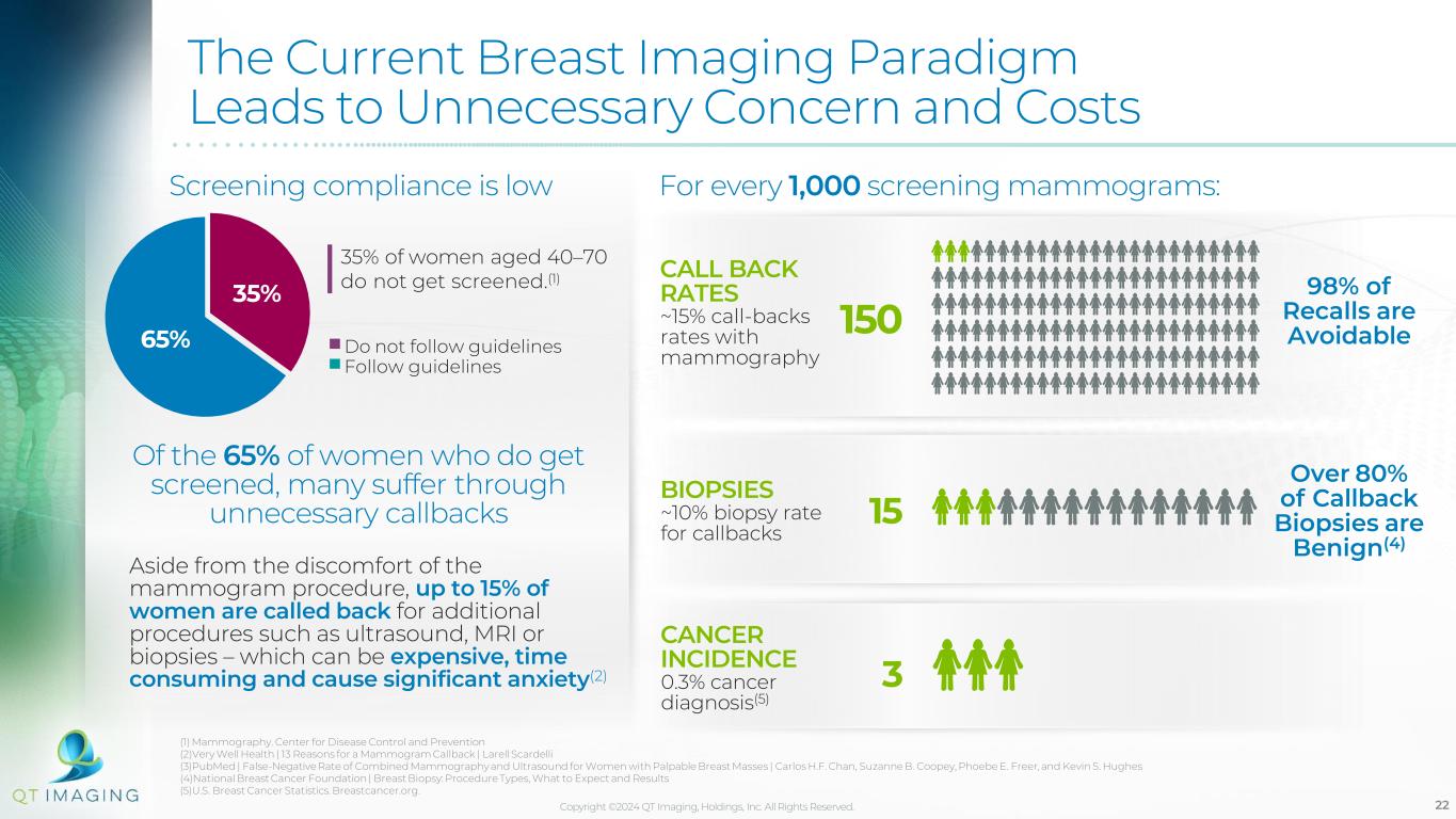 22 35% 65% Do not follow guidelines Follow guidelines Over 80% of Callback Biopsies are Benign(4) 98% of Recalls are Avoidable (1) Mammography. Center for Disease Control and Prevention (2)Very Well Health | 13 Reasons for a Mammogram Callback | Larell Scardelli (3)PubMed | False-Negative Rate of Combined Mammography and Ultrasound for Women with Palpable Breast Masses | Carlos H.F. Chan, Suzanne B. Coopey, Phoebe E. Freer, and Kevin S. Hughes (4)National Breast Cancer Foundation | Breast Biopsy: Procedure Types, What to Expect and Results (5)U.S. Breast Cancer Statistics. Breastcancer.org. The Current Breast Imaging Paradigm Leads to Unnecessary Concern and Costs CALL BACK RATES ~15% call-backs rates with mammography BIOPSIES ~10% biopsy rate for callbacks CANCER INCIDENCE 0.3% cancer diagnosis(5) 150 15 3 For every 1,000 screening mammograms: 35% of women aged 40–70 do not get screened.(1) Screening compliance is low Of the 65% of women who do get screened, many suffer through unnecessary callbacks Aside from the discomfort of the mammogram procedure, up to 15% of women are called back for additional procedures such as ultrasound, MRI or biopsies – which can be expensive, time consuming and cause significant anxiety(2) Copyright ©2024 QT Imaging, Holdings, Inc. All Rights Reserved.