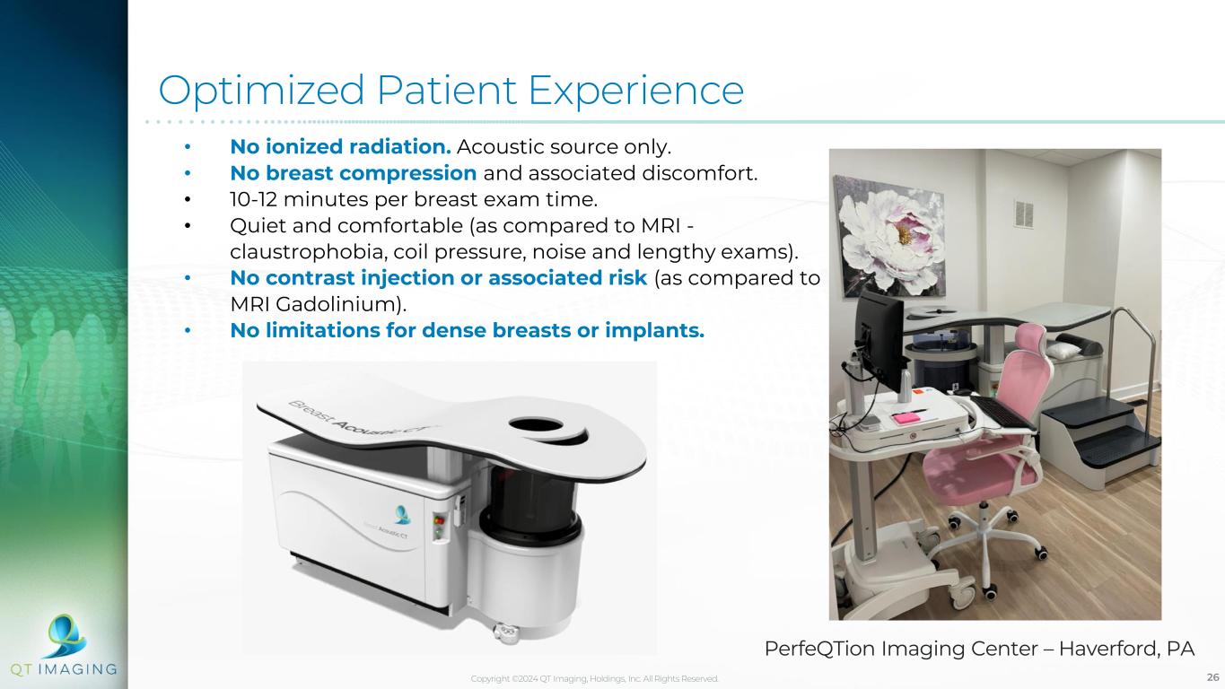 25Copyright ©2024 QT Imaging, Inc. All Rights Reserved. Quantitative Transmission (QT) Imaging • What is QT Imaging? − Inherently 3D volumetric ultrasound modality due to 3D data acquisition and image reconstruction − Uses CT-like configuration with ultrasound to acquire and reconstruct transmission images which map the speed-of-sound across the tissue volume − High resolution, similar to MRI − Images tissue without overlap, providing more information than conventional HHUS − Overcomes operator dependence and lack of standardization associated with HHUS − Pain free, safe • Image Acquisition: − Prone position with breast submerged in water − 360-degree rotation of ultrasound arrays − 10-12 minutes per breast average scan time