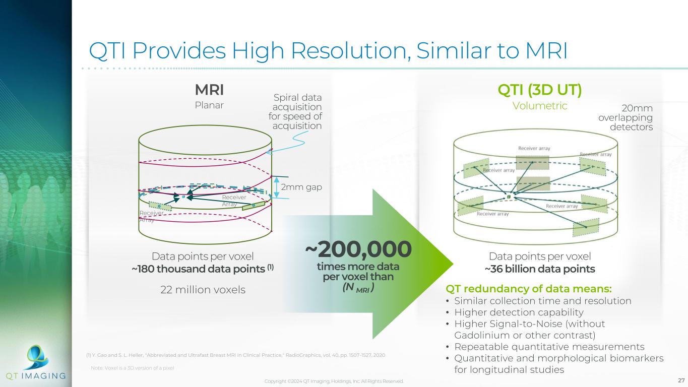 26 Optimized Patient Experience • No ionized radiation. Acoustic source only. • No breast compression and associated discomfort. • 10-12 minutes per breast exam time. • Quiet and comfortable (as compared to MRI - claustrophobia, coil pressure, noise and lengthy exams). • No contrast injection or associated risk (as compared to MRI Gadolinium). • No limitations for dense breasts or implants. PerfeQTion Imaging Center – Haverford, PA Copyright ©2024 QT Imaging, Holdings, Inc. All Rights Reserved.