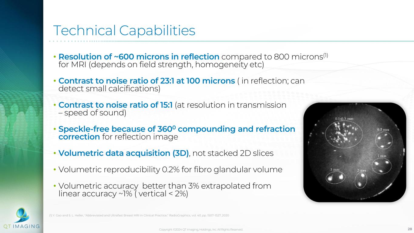 27 QTI Provides High Resolution, Similar to MRI MRI QTI (3D UT) VolumetricPlanar QT redundancy of data means: • Similar collection time and resolution • Higher detection capability • Higher Signal-to-Noise (without Gadolinium or other contrast) • Repeatable quantitative measurements • Quantitative and morphological biomarkers for longitudinal studies Data points per voxel ~36 billion data points 22 million voxels Data points per voxel ~180 thousand data points (1) 20mm overlapping detectors Receiver Array Receiver Array 2mm gap Spiral data acquisition for speed of acquisition Note: Voxel is a 3D version of a pixel ~200,000 times more data per voxel than (N MRI ) Copyright ©2024 QT Imaging, Holdings, Inc. All Rights Reserved. (1) Y. Gao and S. L. Heller, "Abbreviated and Ultrafast Breast MRI in Clinical Practice," RadioGraphics, vol. 40, pp. 1507-1527, 2020