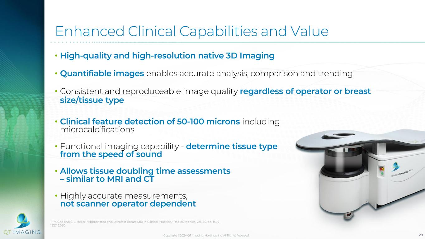 28 Technical Capabilities • Resolution of ~600 microns in reflection compared to 800 microns(1) for MRI (depends on field strength, homogeneity etc) • Contrast to noise ratio of 23:1 at 100 microns ( in reflection; can detect small calcifications) • Contrast to noise ratio of 15:1 (at resolution in transmission – speed of sound) • Speckle-free because of 3600 compounding and refraction correction for reflection image • Volumetric data acquisition (3D), not stacked 2D slices • Volumetric reproducibility 0.2% for fibro glandular volume • Volumetric accuracy better than 3% extrapolated from linear accuracy ~1% ( vertical < 2%) (1) Y. Gao and S. L. Heller, "Abbreviated and Ultrafast Breast MRI in Clinical Practice," RadioGraphics, vol. 40, pp. 1507-1527, 2020 Copyright ©2024 QT Imaging, Holdings, Inc. All Rights Reserved.