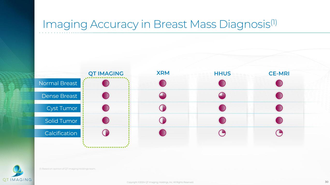 30 Normal Breast Dense Breast Cyst Tumor Solid Tumor Calcification Imaging Accuracy in Breast Mass Diagnosis(1) QT IMAGING HHUSXRM CE-MRI Copyright ©2024 QT Imaging, Holdings, Inc. All Rights Reserved. (1) Based on opinion of QT Imaging Holdings team..