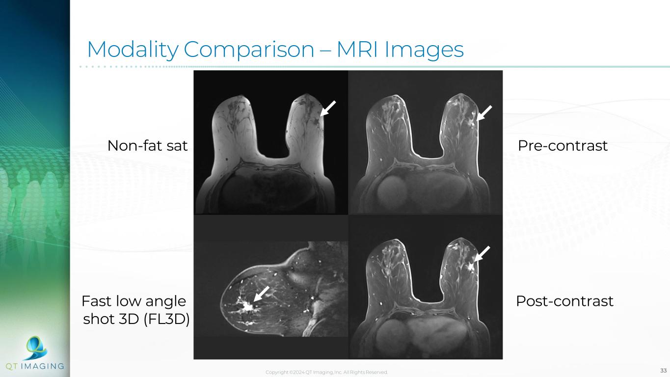 33 Modality Comparison – MRI Images Non-fat sat Pre-contrast Post-contrastFast low angle shot 3D (FL3D) Copyright ©2024 QT Imaging, Inc. All Rights Reserved.