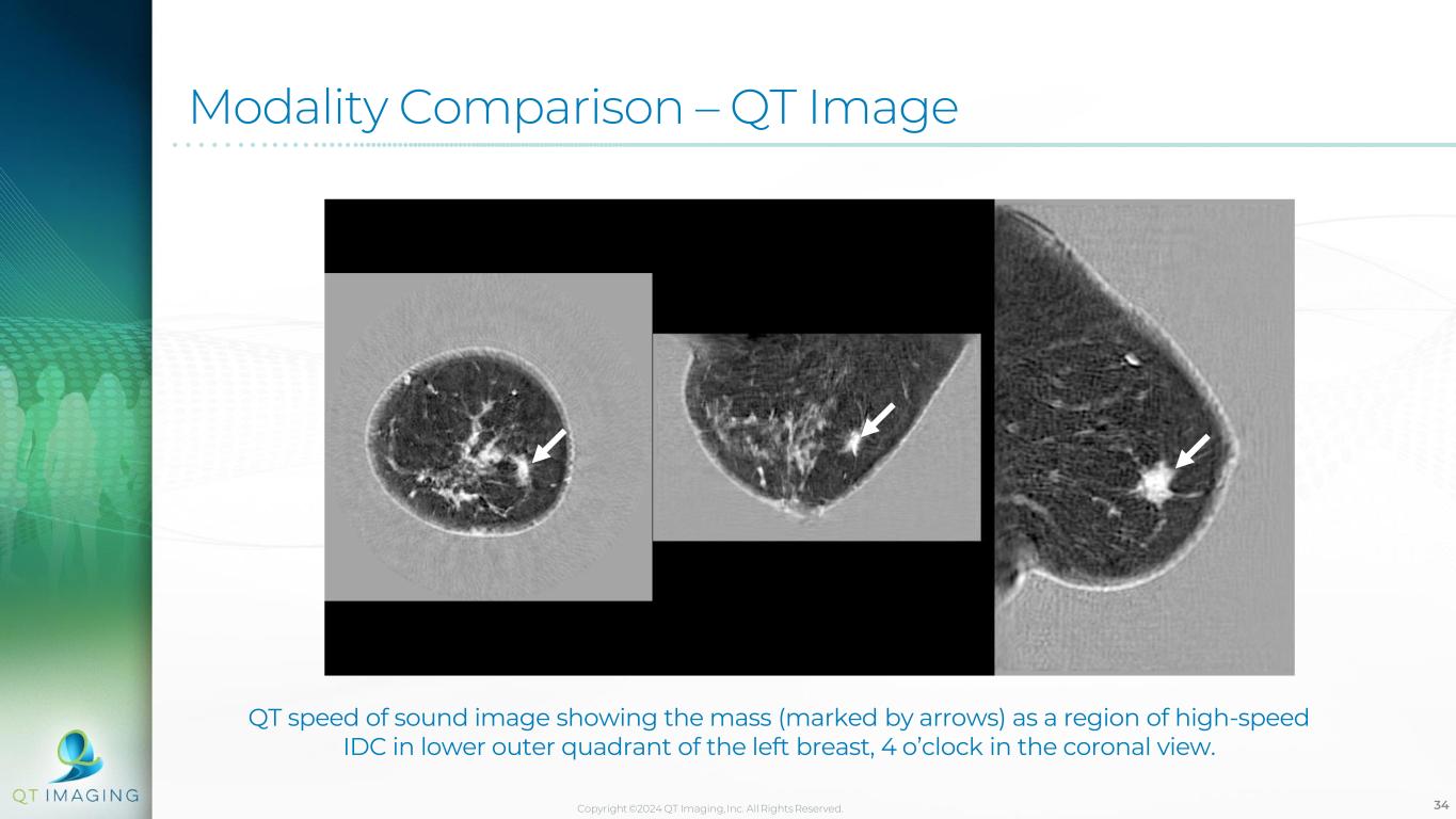 34 Modality Comparison – QT Image QT speed of sound image showing the mass (marked by arrows) as a region of high-speed IDC in lower outer quadrant of the left breast, 4 o’clock in the coronal view. Copyright ©2024 QT Imaging, Inc. All Rights Reserved.