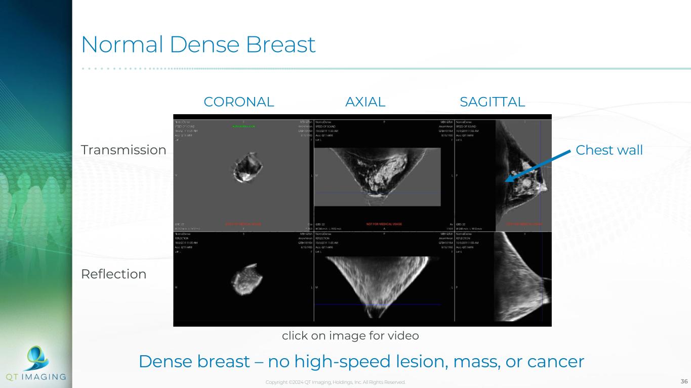 36 Normal Dense Breast CORONAL AXIAL SAGITTAL Transmission Reflection Dense breast – no high-speed lesion, mass, or cancer click on image for video Copyright ©2024 QT Imaging, Holdings, Inc. All Rights Reserved. Chest wall