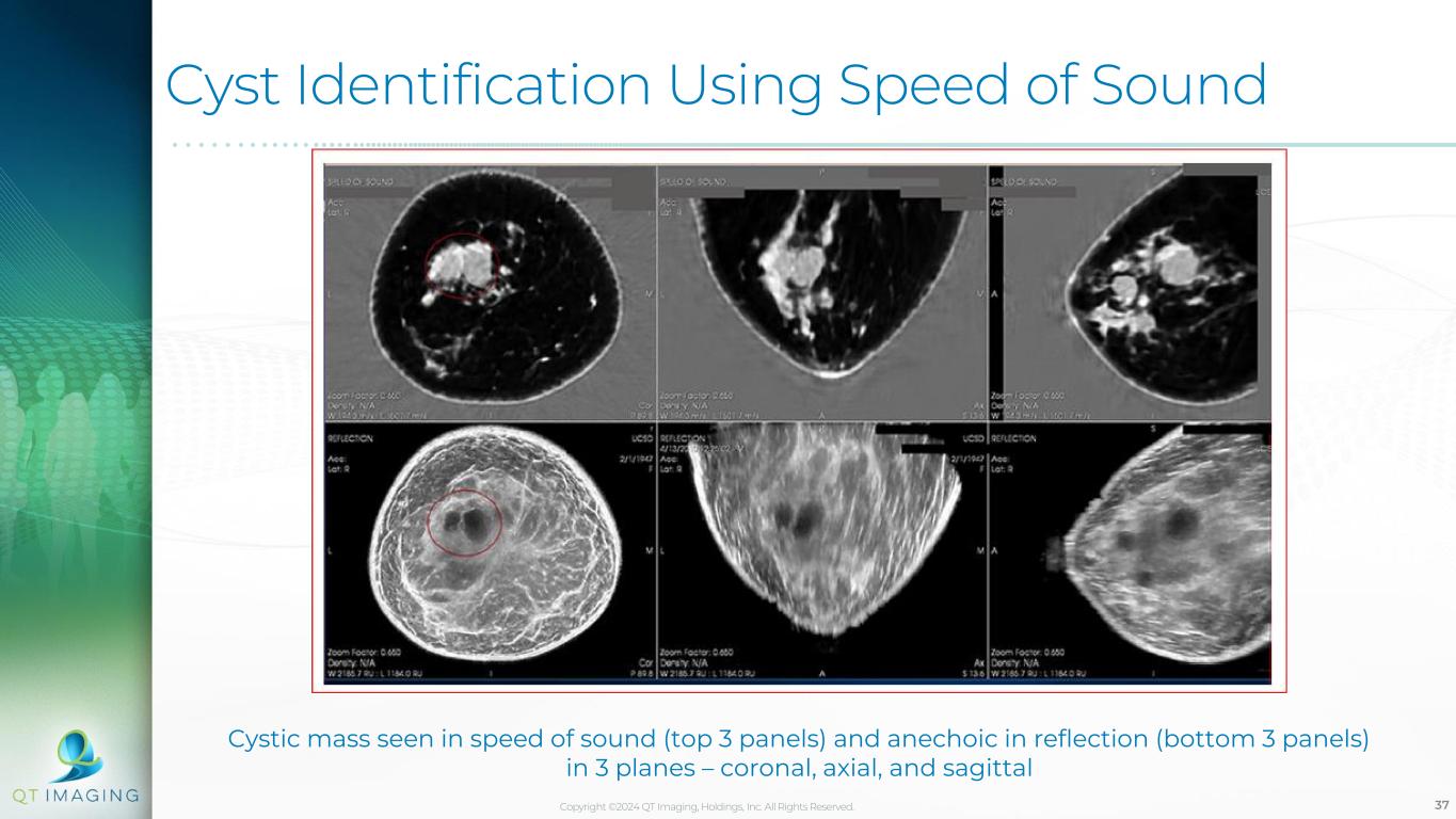 37 Cyst Identification Using Speed of Sound Cystic mass seen in speed of sound (top 3 panels) and anechoic in reflection (bottom 3 panels) in 3 planes – coronal, axial, and sagittal Copyright ©2024 QT Imaging, Holdings, Inc. All Rights Reserved.